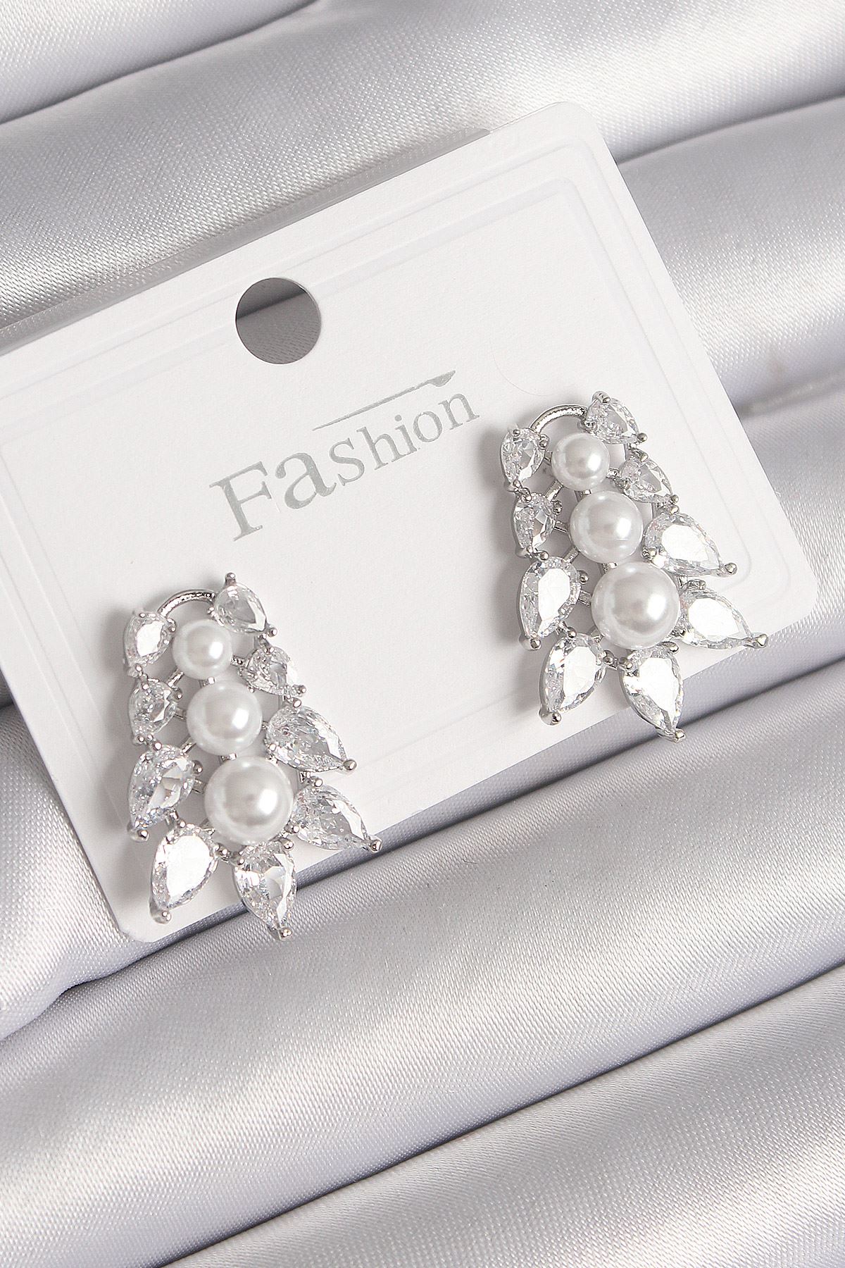 YRTCL Pirinç Gümüş Renk Zirkon Taşlı Yaprak Model İnci Detay Kadın Küpe