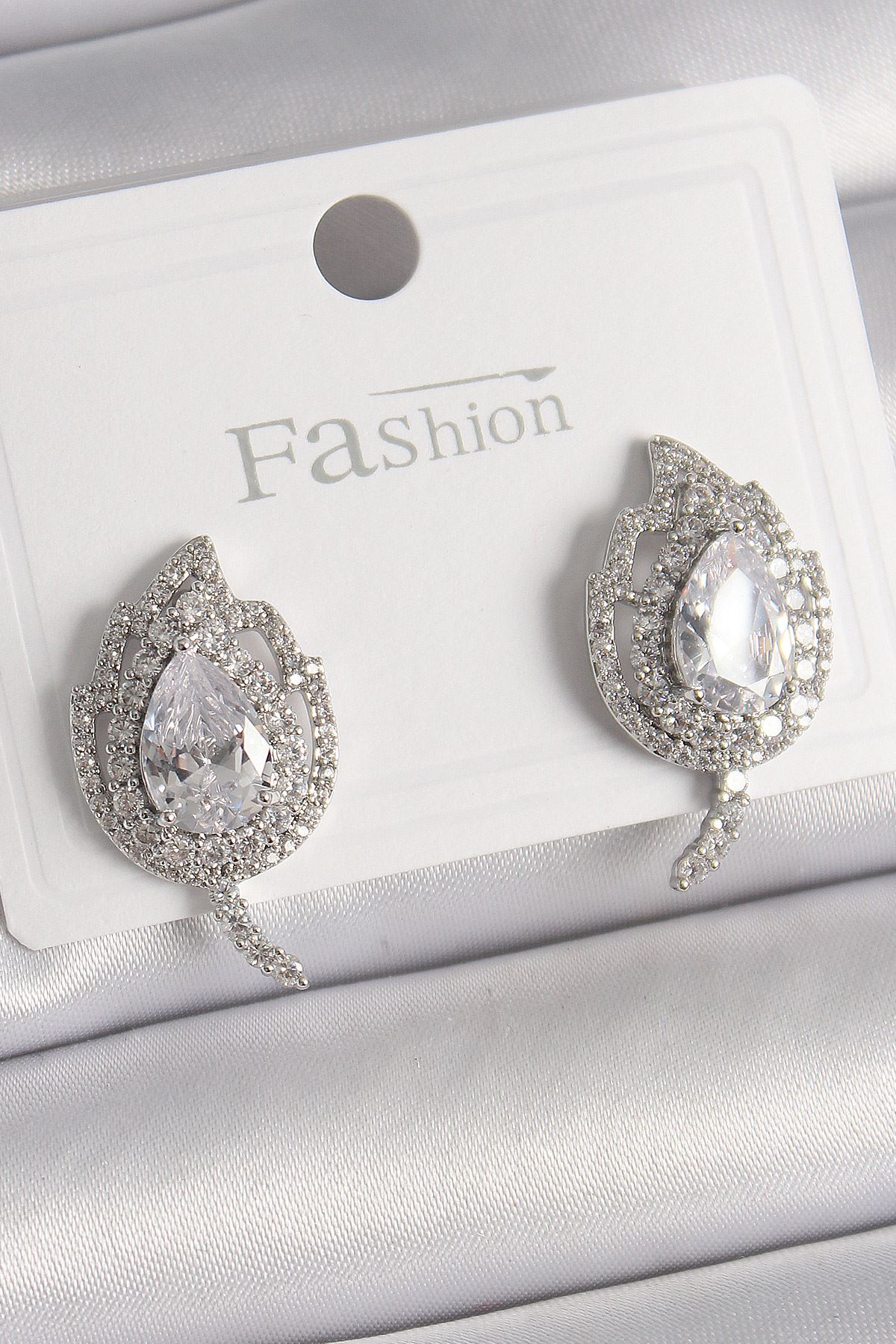 YRTCL Pirinç Gümüş Renk Zirkon Taşlı Yaprak Model Kadın Küpe