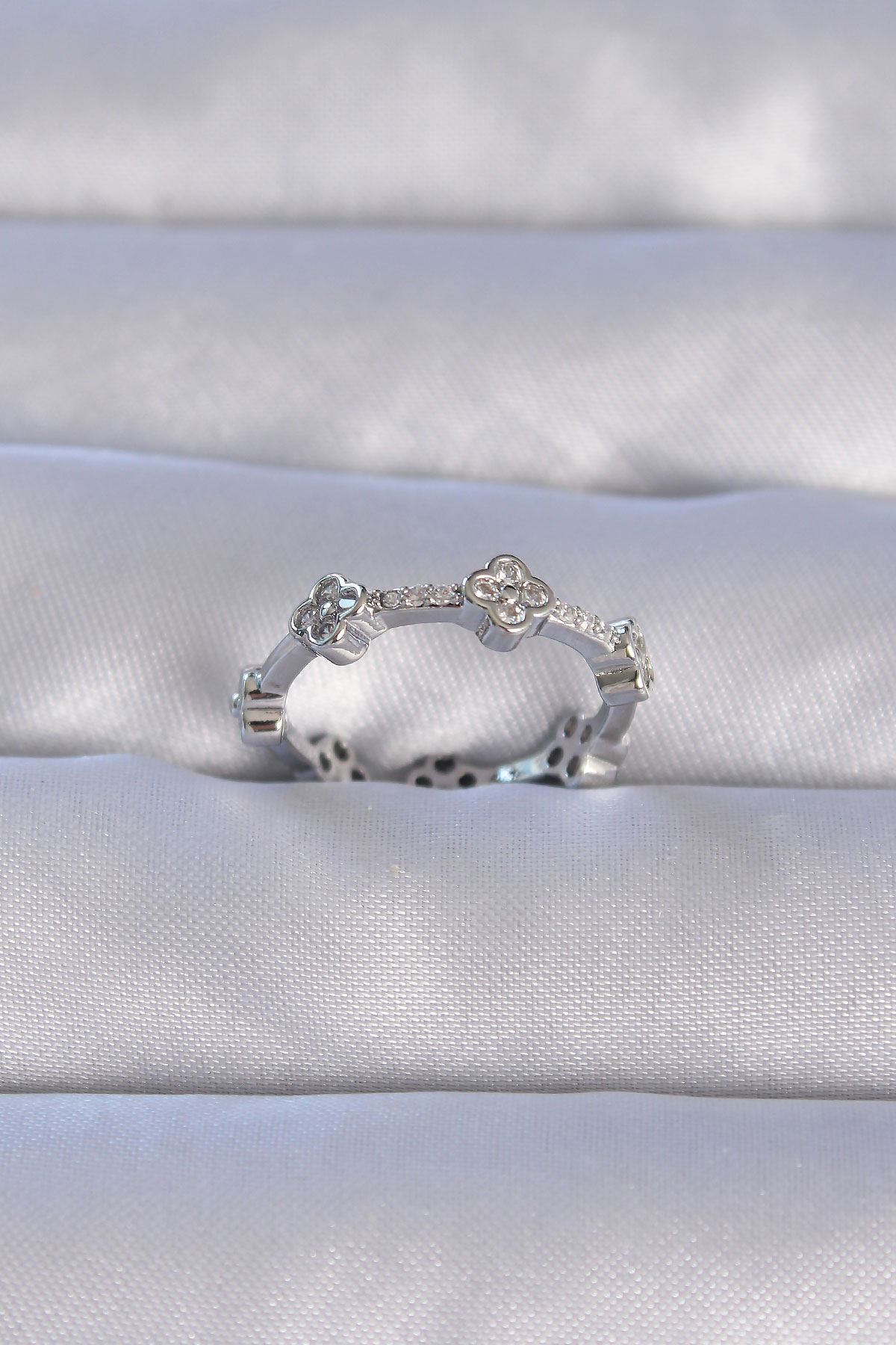 YRTCL Pirinç Gümüş Renk Zirkon Taşlı Yonca Model Ayarlanabilir Yüzük