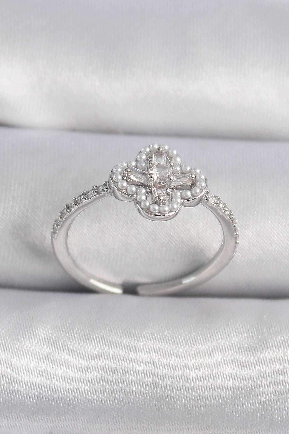 YRTCL Pirinç Gümüş Renk Zirkon Taşlı Yonca Model İnci Detay Kadın Yüzük