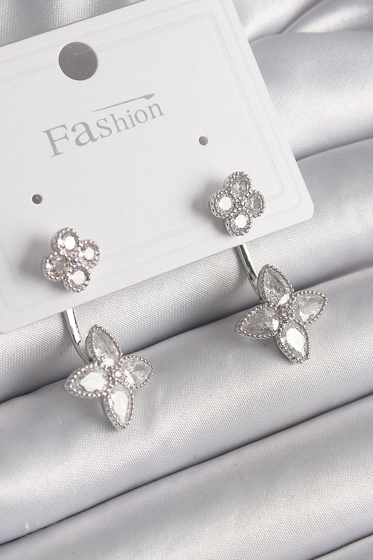 YRTCL Pirinç Gümüş Renk Zirkon Taşlı 2'Li Çiçek Model Kadın Küpe