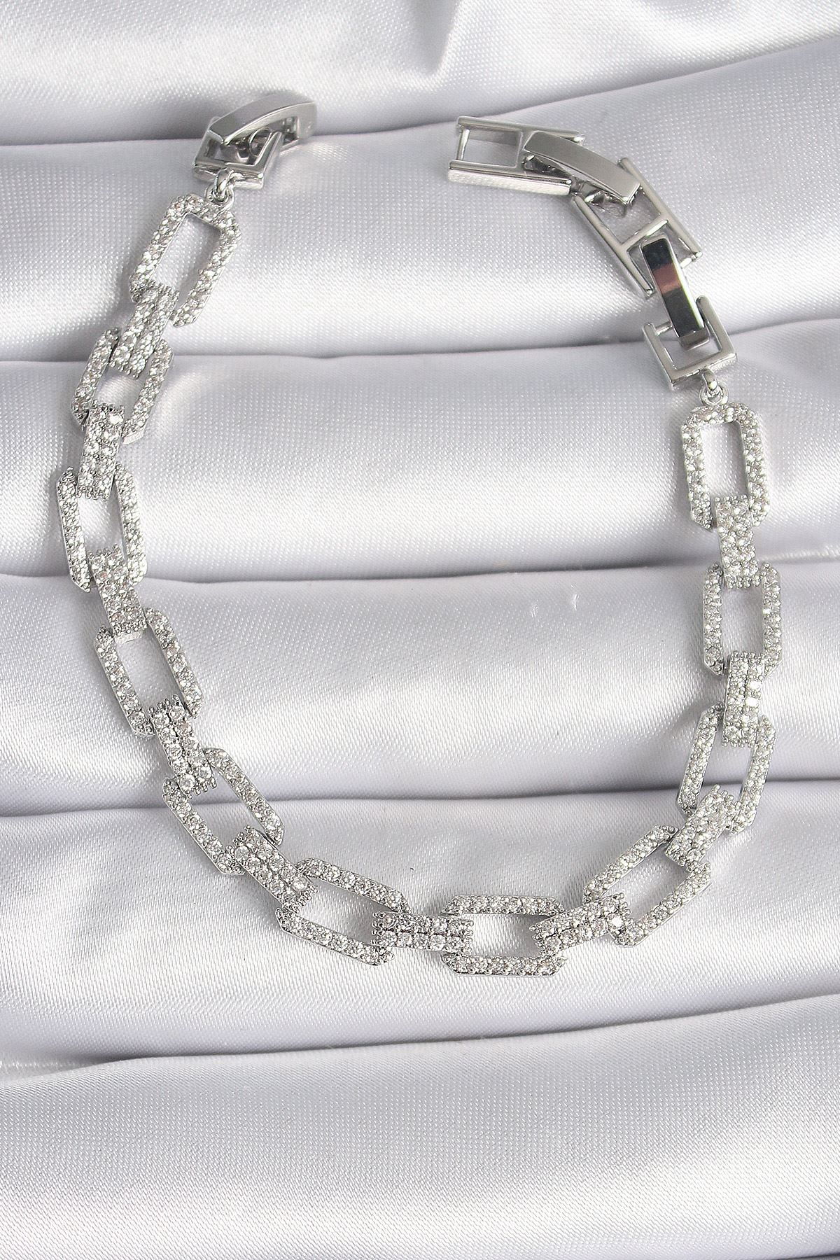 YRTCL Pirinç Gümüş Renk Zirkon Taşlı Zincir Model VIP Seri Kadın Bileklik