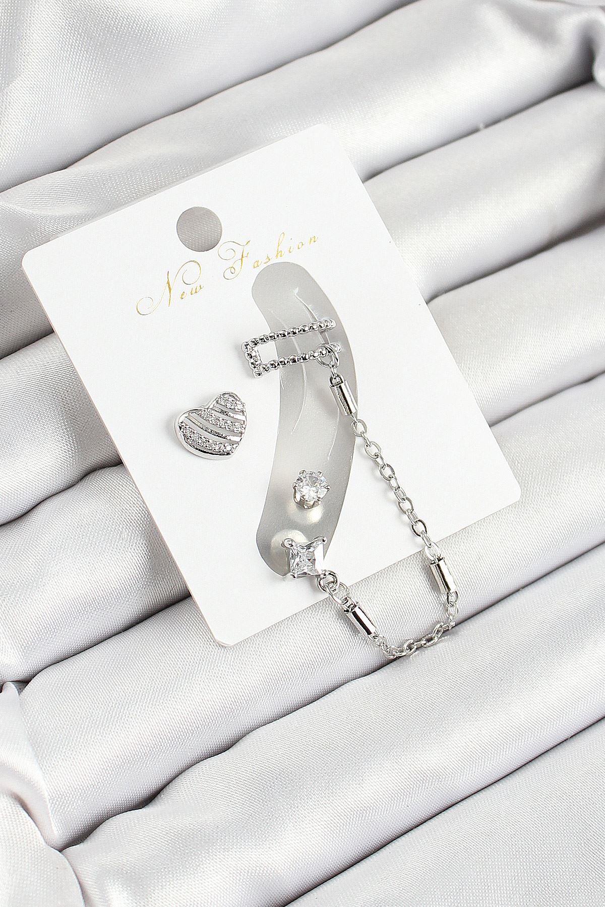 YRTCL Pirinç Kalp Figürlü Zirkon Taşlı Gümüş Renk 3'lü Kıkırdak Kadın Küpe Set