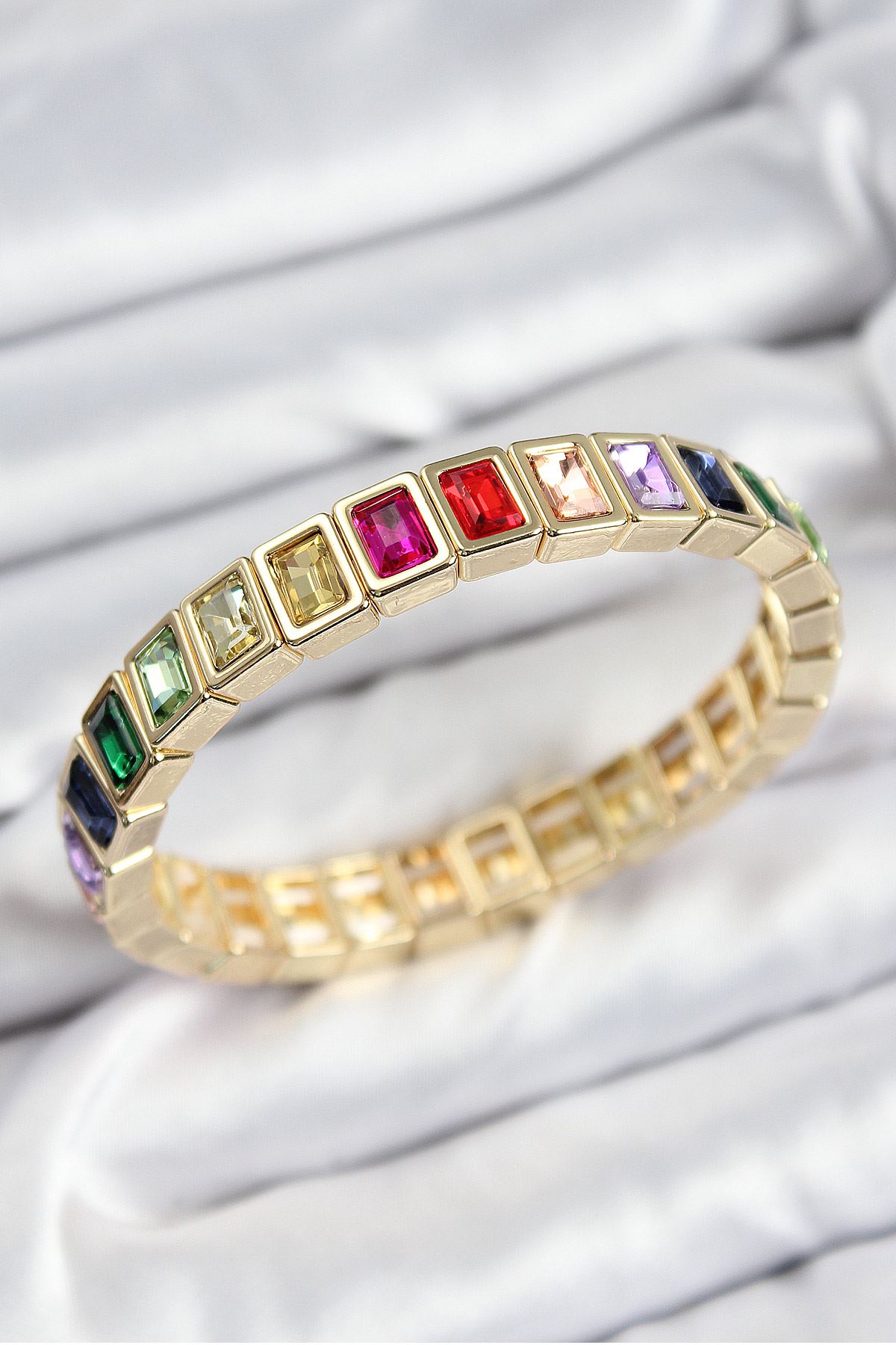 YRTCL Pirinç Karışık Zirkon Taşlı Dikdörtgen Model Gold Renk Lastikli Kadın Bileklik