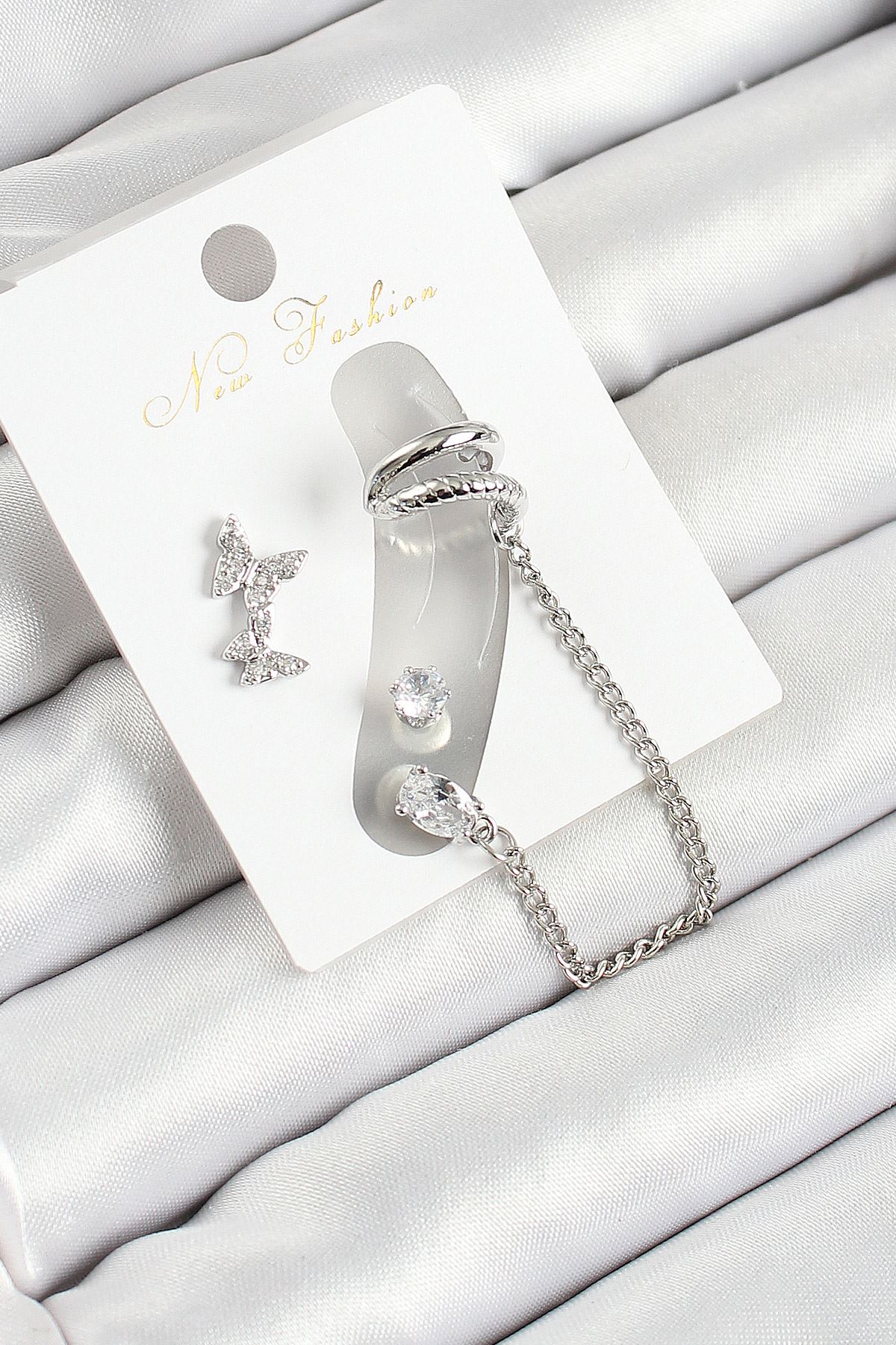 YRTCL Pirinç Kelebek Figürlü Zirkon Taşlı Gümüş Renk 3'lü Kıkırdak Kadın Küpe Set