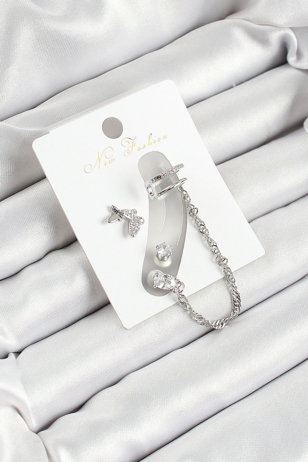 YRTCL Pirinç Kelebek Figürlü Zirkon Taşlı Gümüş Renk 3'lü Kıkırdak Kadın Küpe Set