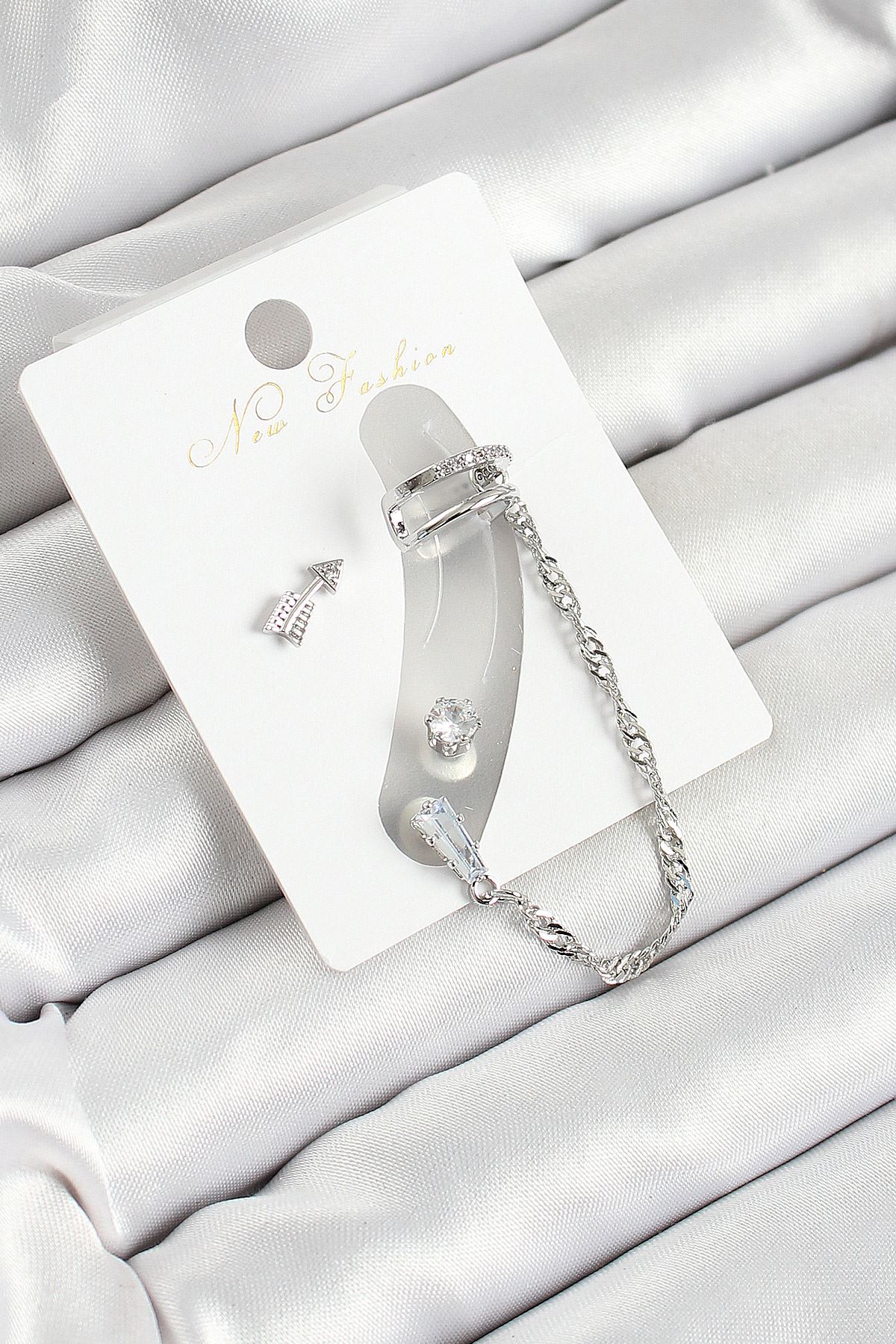 YRTCL Pirinç Ok Figürlü Zirkon Taşlı Gümüş Renk 3'lü Kıkırdak Kadın Küpe Set