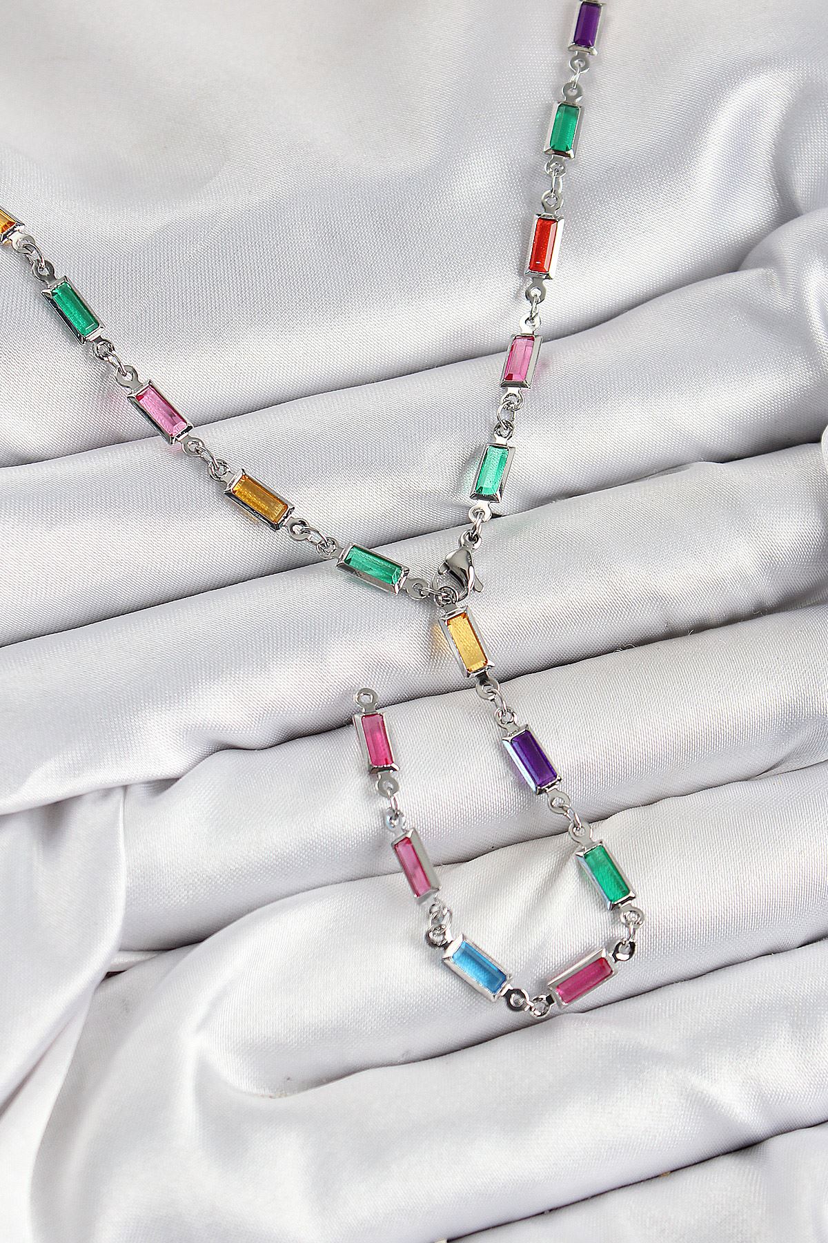 YRTCL Pirinç Renkli Zirkon Taşlı Dikdörtgen Model Gümüş Renk Kadın Y Kolye