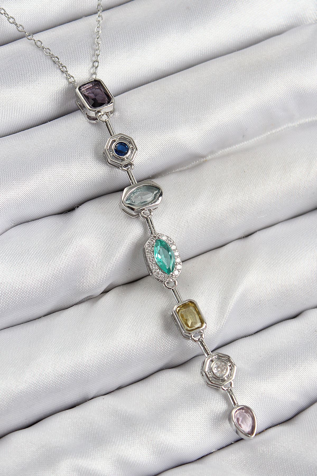 YRTCL Pirinç Renkli Zirkon Taşlı Model Gümüş Renk 7 Element Kadın Y Kolye