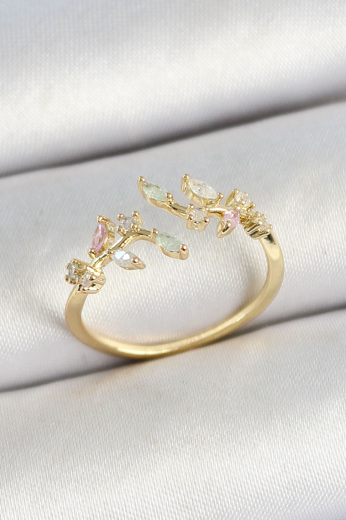 YRTCL Pirinç Yaprak Figürlü Zirkon Taşlı Gold Renk Ayarlanabilir Kadın Yüzük