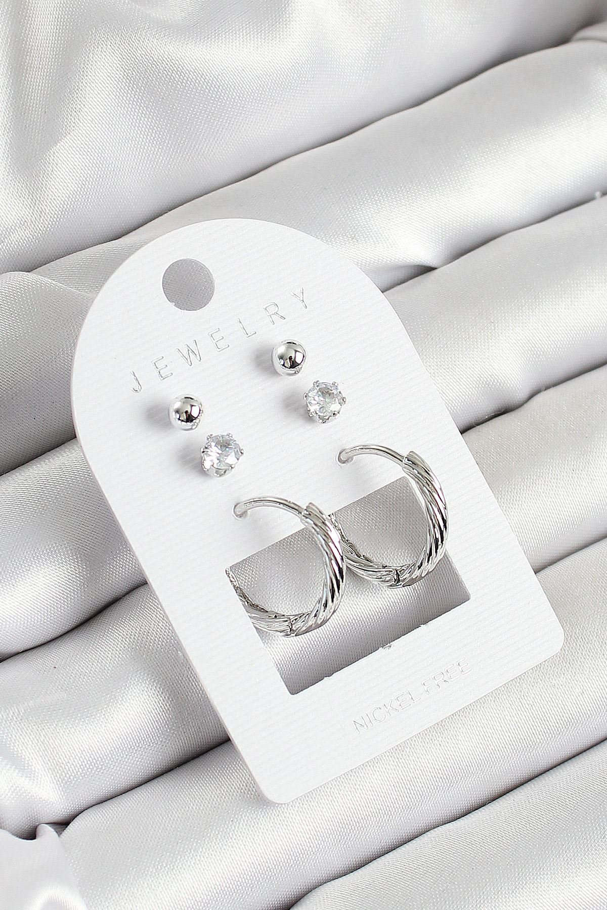 YRTCL Pirinç Zirkon Taş Ve Halka Figürlü Gümüş Renk 3'lü Çift Kadın Küpe Set