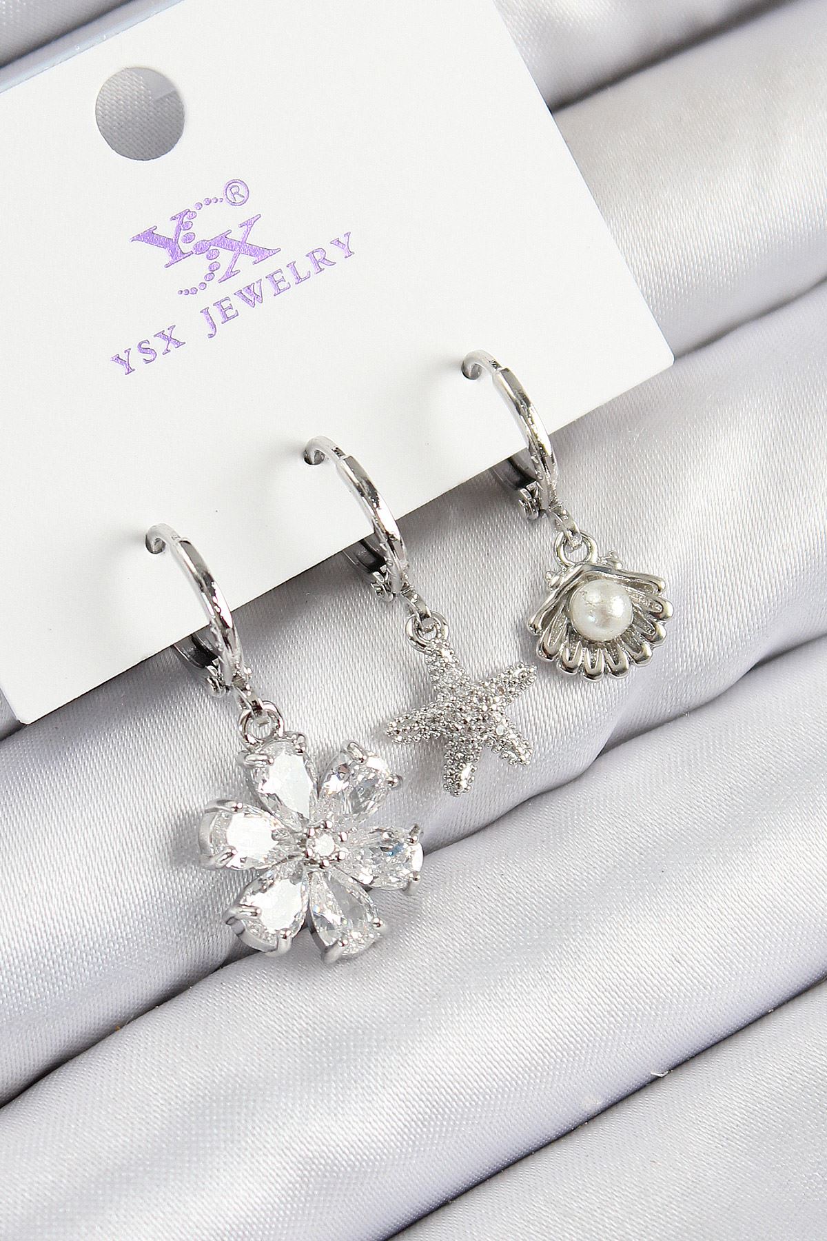 YRTCL Pirinç Zirkon Taşlı 3'lü Çiçek Ve İstiridye Model Gümüş Renk Kadın Küpe