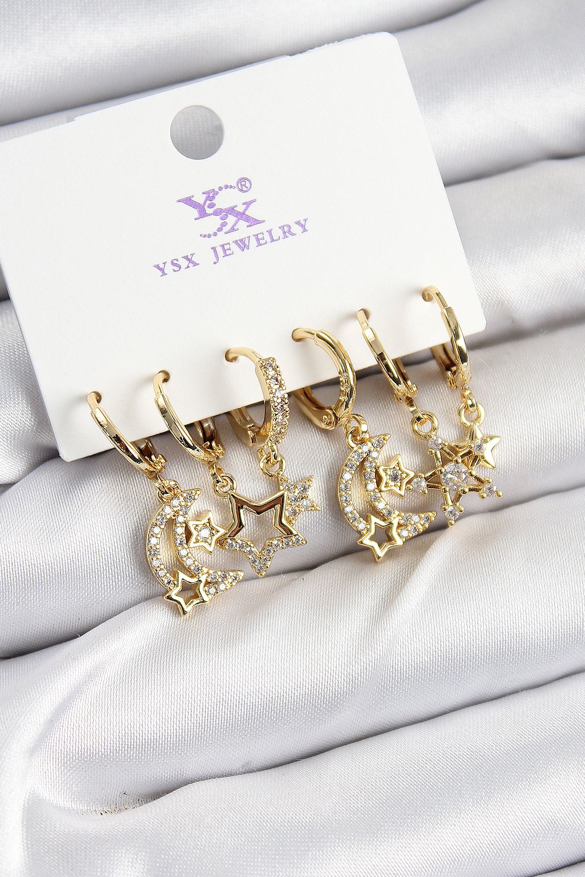 YRTCL Pirinç Zİrkon Taşlı Ay ve Yıldız Model Gold Renk 3'lü Çift Kadın Küpe