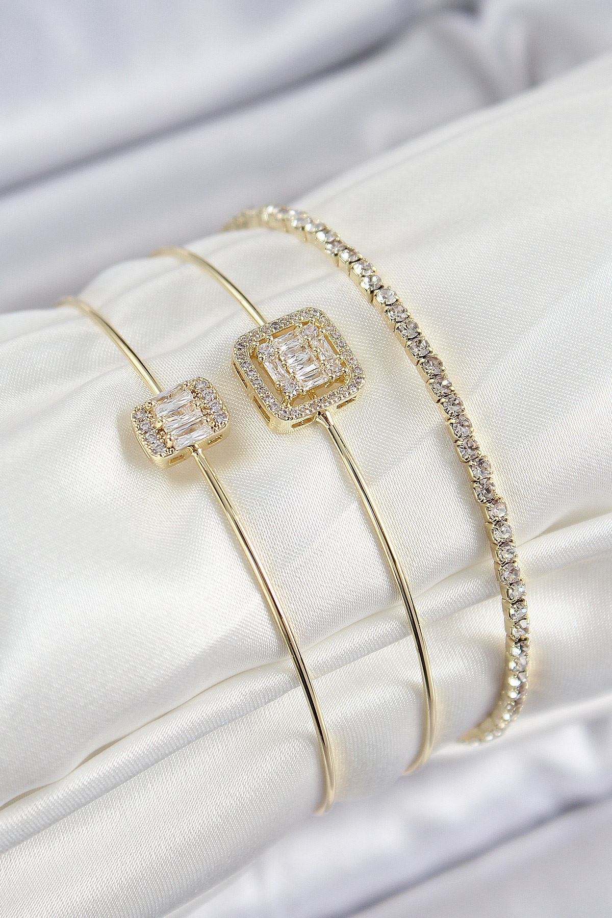 YRTCL Pirinç Zirkon Taşlı Baget Model Gold Renk Vip 3'lü Kadın Bileklik