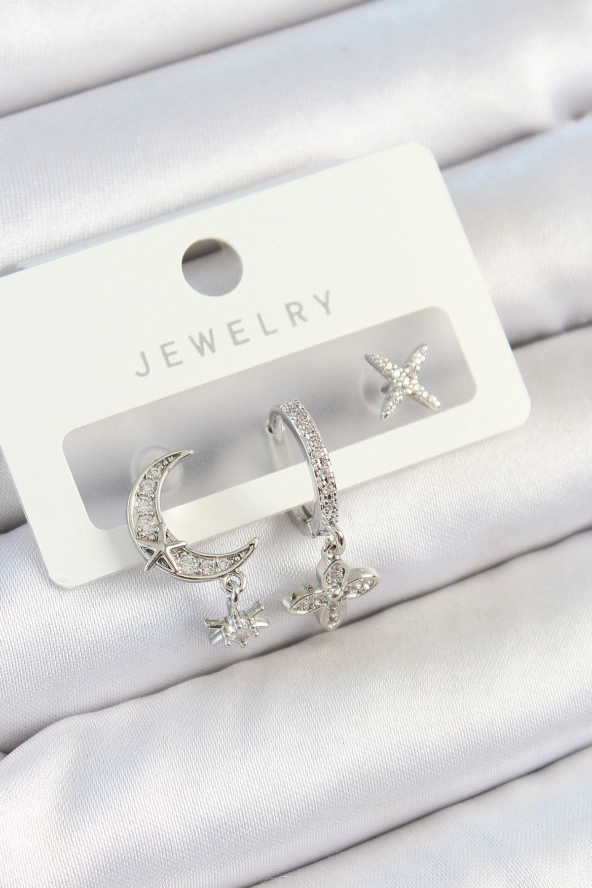 YRTCL Pirinç Zirkon Taşlı Çiçek Ve Ay Model Gümüş Renk 3'lü Çift Kadın Küpe Set