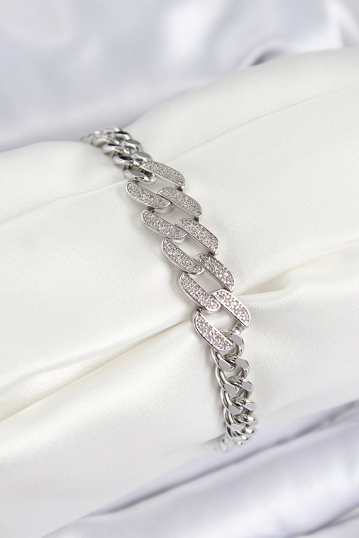 YRTCL Pirinç Zirkon Taşlı Ezme Küba Zincir Model Gümüş Renk Kadın Bileklik