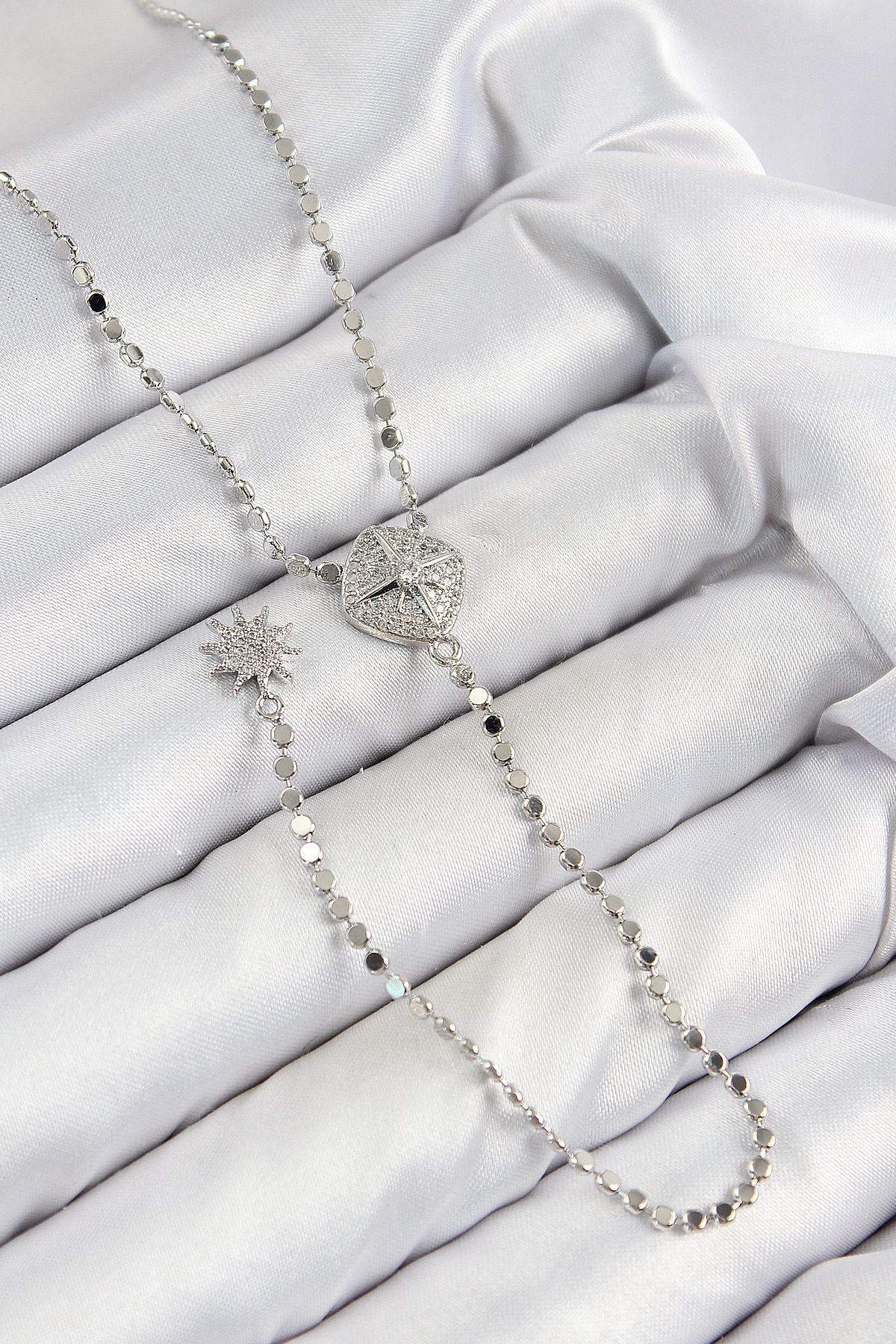 YRTCL Pirinç Zirkon Taşlı Ezme Zincirli Madalyon Model Gümüş Renk Y Kolye