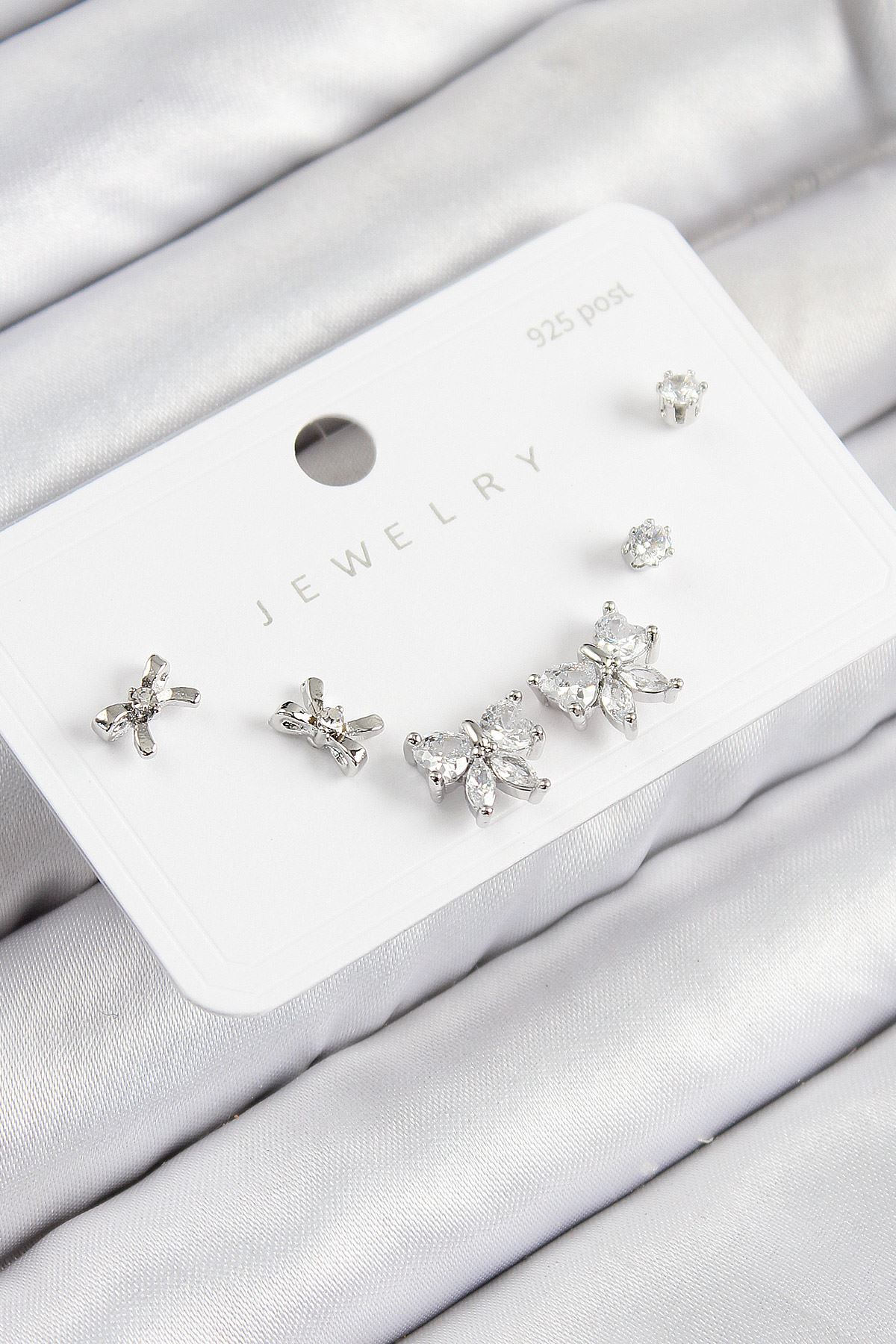 YRTCL Pirinç Zirkon Taşlı Fiyonk Model Gümüş Renk 925 Ayar Gümüş Çivi Kadın Küpe Set