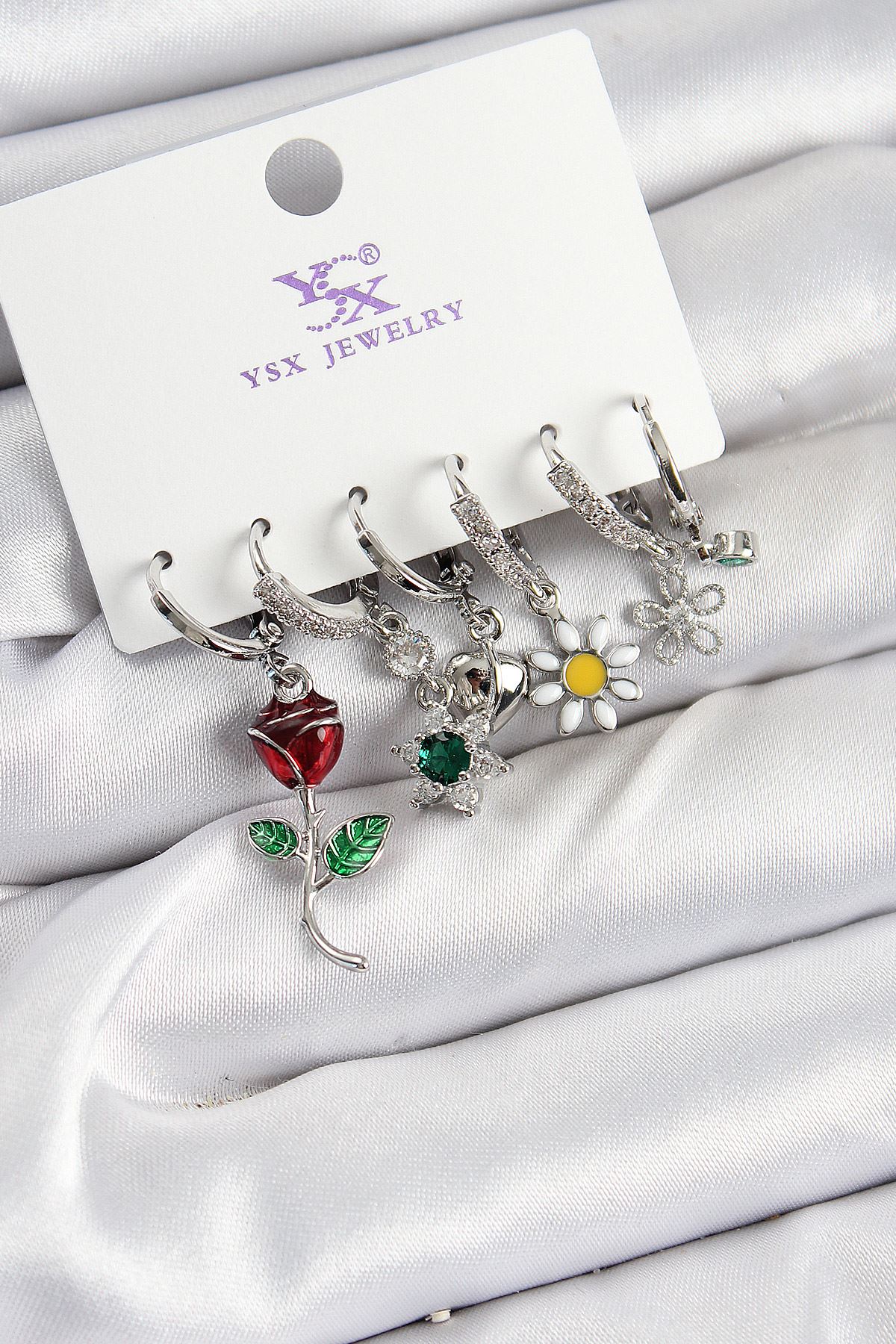 YRTCL Pirinç Zİrkon Taşlı Gül Ve Papatya Model Gümüş Renk 3'lü Çift Kadın Küpe