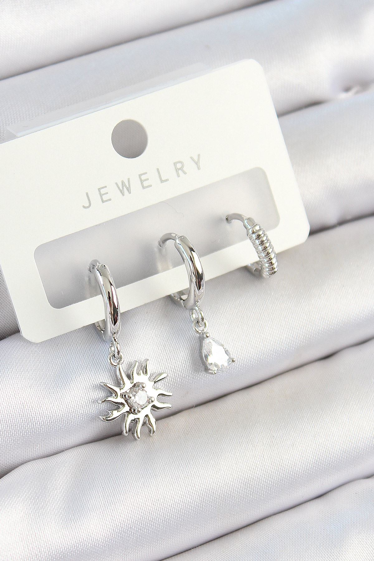 YRTCL Pirinç Zirkon Taşlı Güneş Model Gümüş Renk 3'lü Çift Kadın Küpe Set