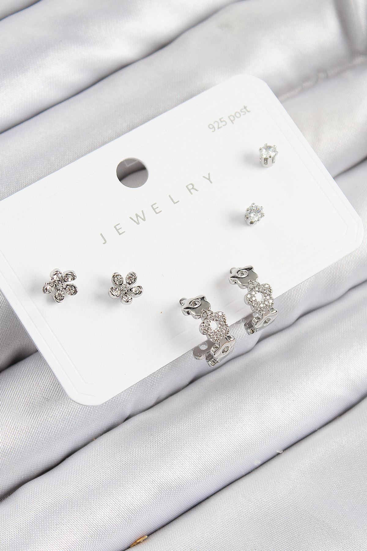 YRTCL Pirinç Zirkon Taşlı 3'lü Kuş Model Gümüş Renk Kadın Küpe