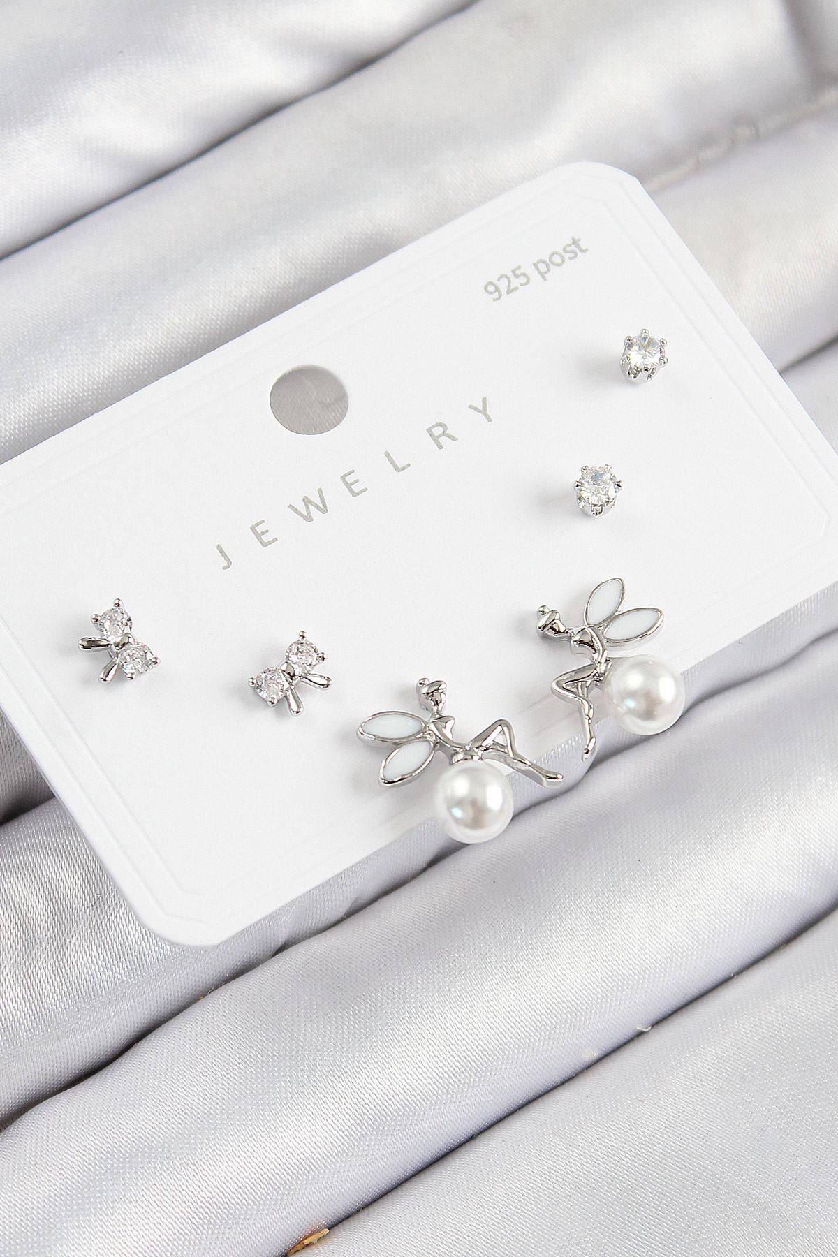 YRTCL Pirinç Zirkon Taşlı İnci Melek Model Gümüş Renk 925 Ayar Gümüş Çivi Kadın Küpe Set