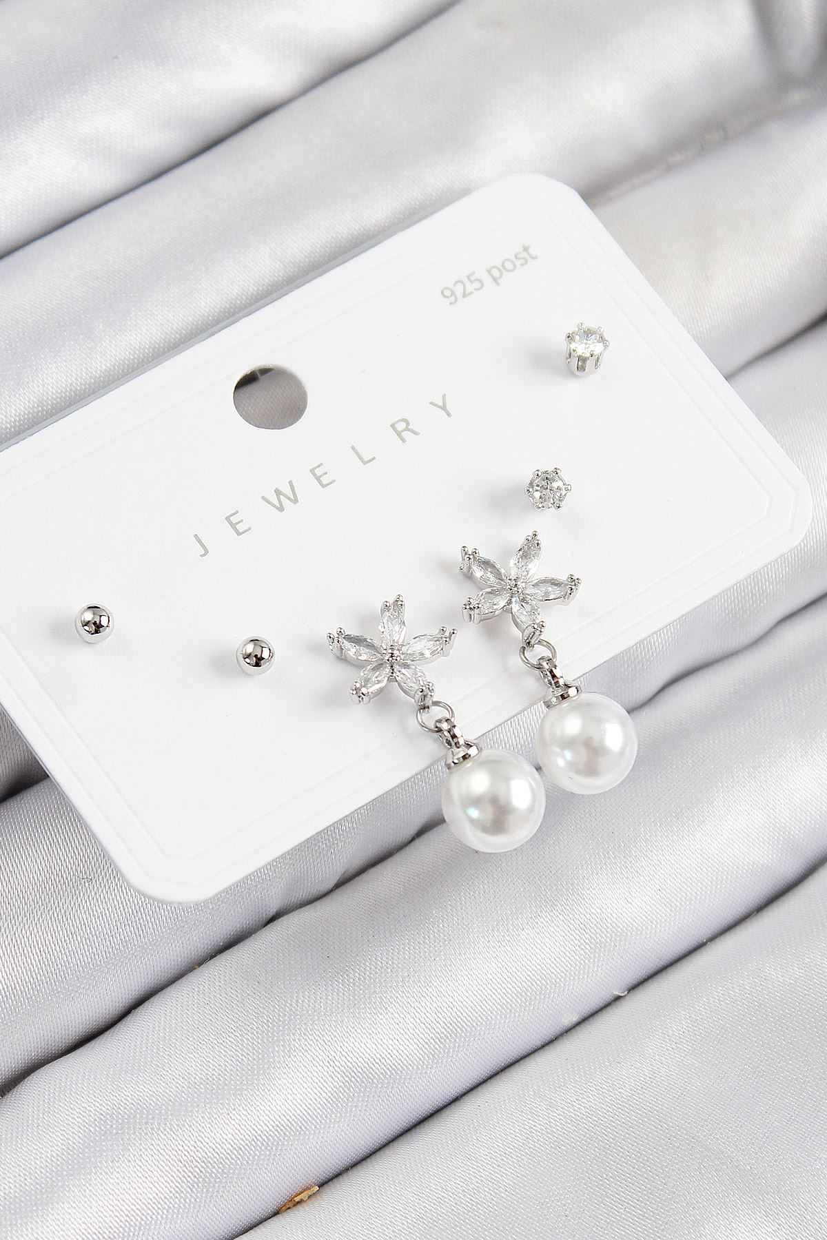 YRTCL Pirinç Zirkon Taşlı İnci Sallantılı Çiçek Model Gümüş Renk 925 Ayar Gümüş Çivi Kadın Küpe Set