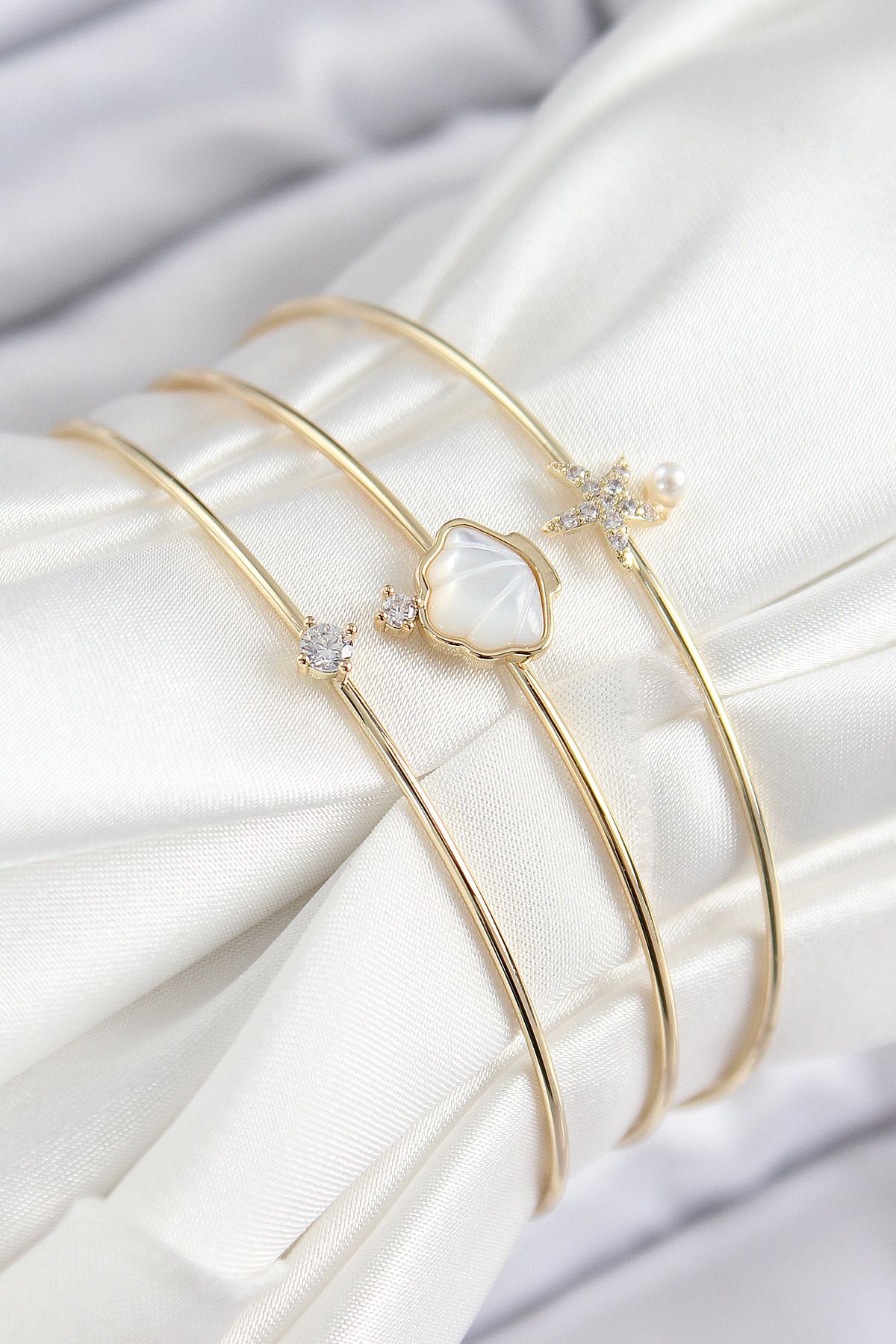 YRTCL Pirinç Zirkon Taşlı İstiridye Ve Deniz Yıldızı Model Gold Renk Vip 3'lü Kadın Bileklik