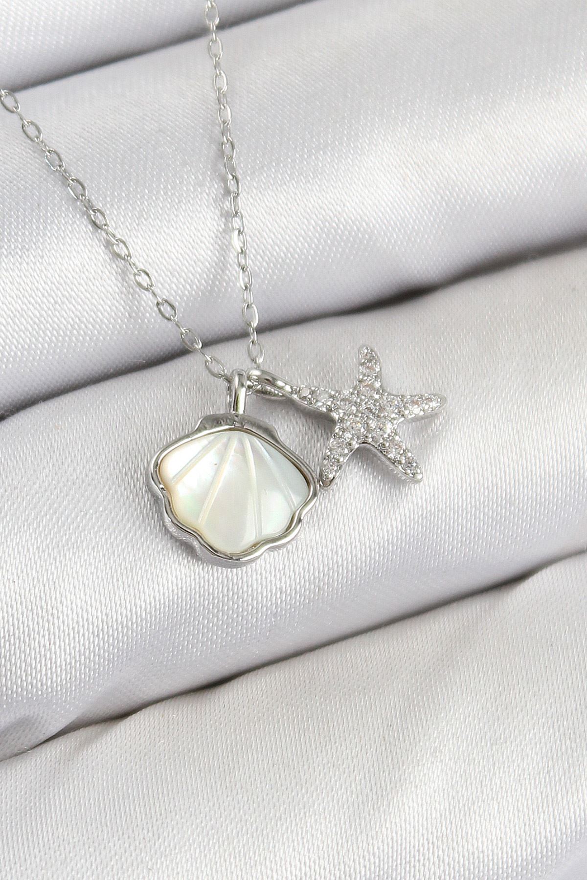 YRTCL Pirinç Zirkon Taşlı İstiridye Ve Deniz Yıldızı Model Gümüş Renk Kadın Kolye