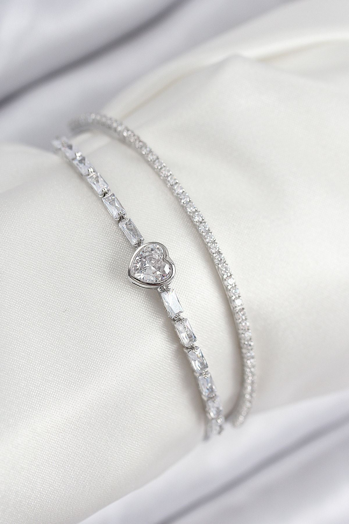 YRTCL Pirinç Zirkon Taşlı Kalp Model Gümüş Renk Kadın Bileklik