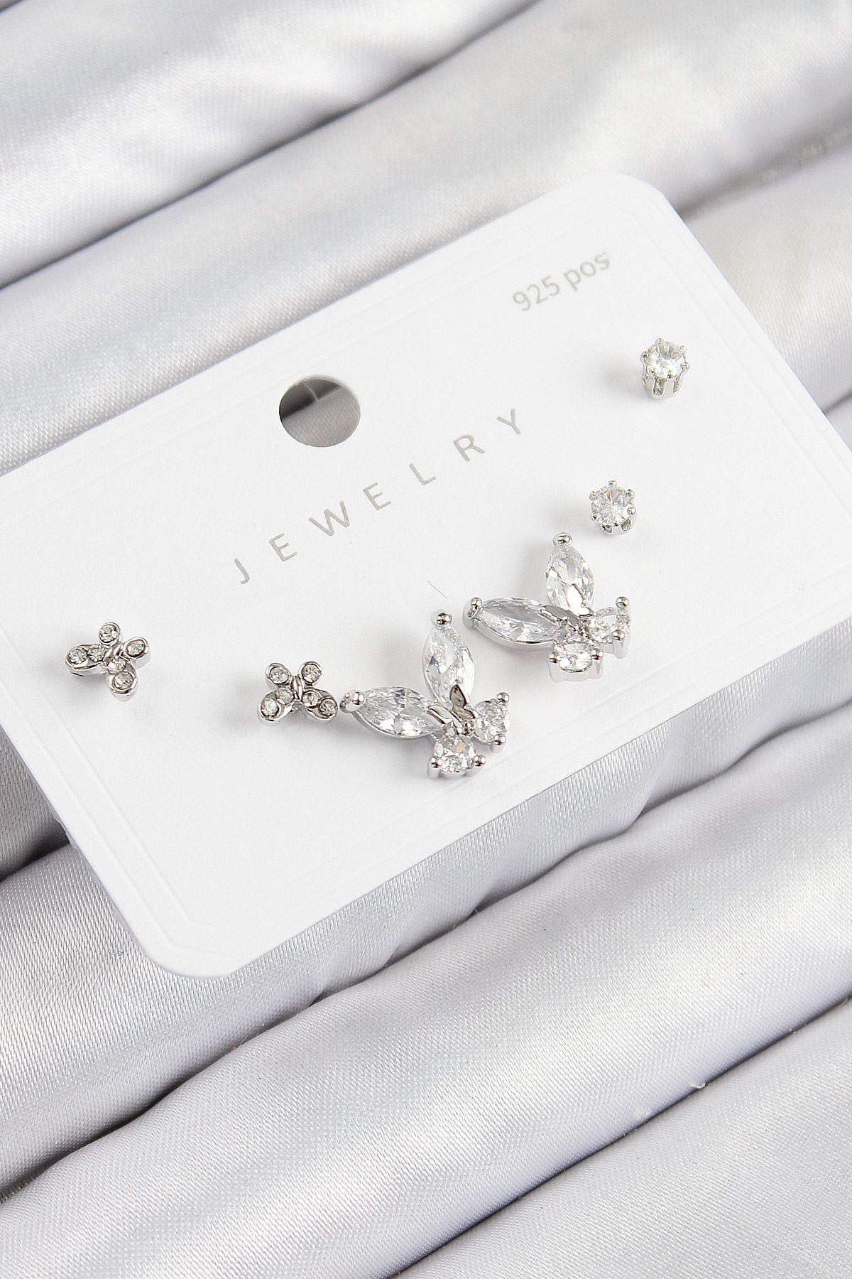 YRTCL Pirinç Zirkon Taşlı Kelebek Model Gümüş Renk 925 Ayar Gümüş Çivi Kadın Küpe Set