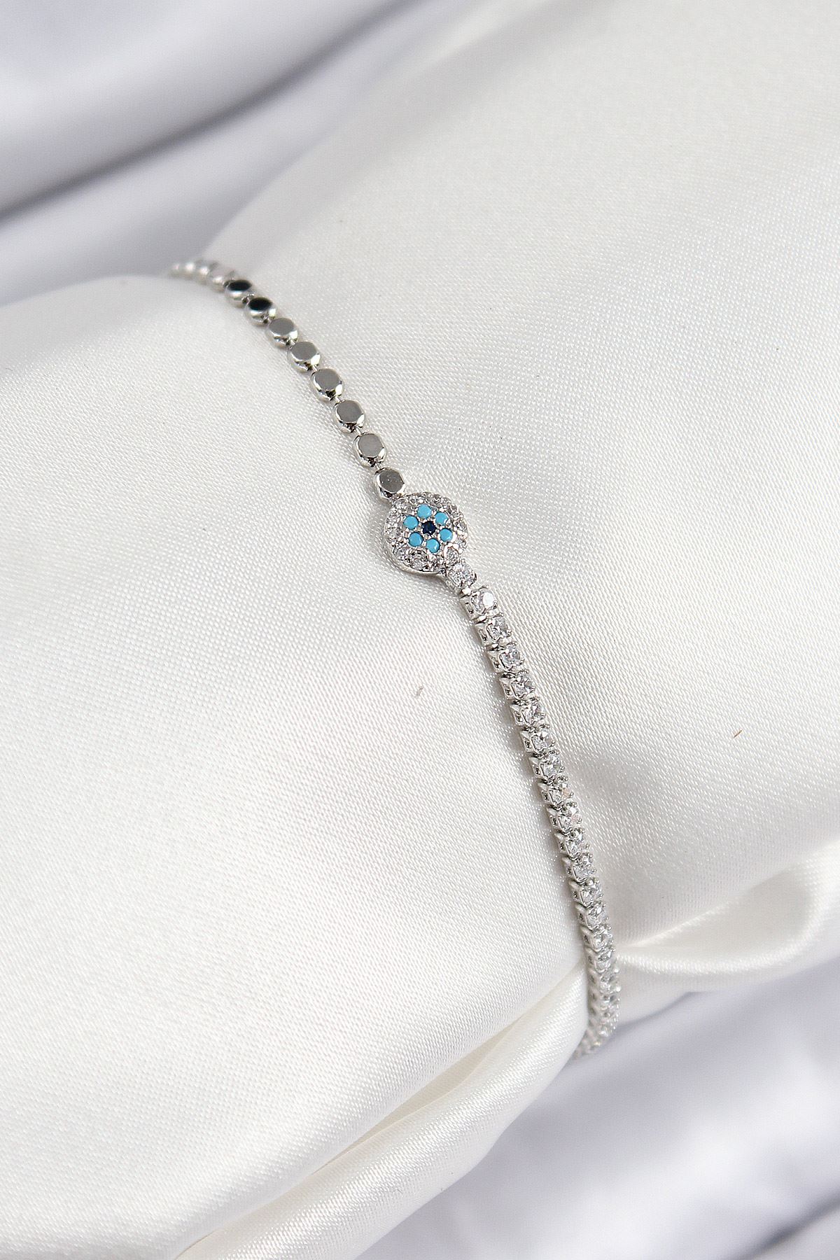 YRTCL Pirinç Zirkon Taşlı Nazar Model Ezme Zincir Gümüş Renk Kadın Bileklik