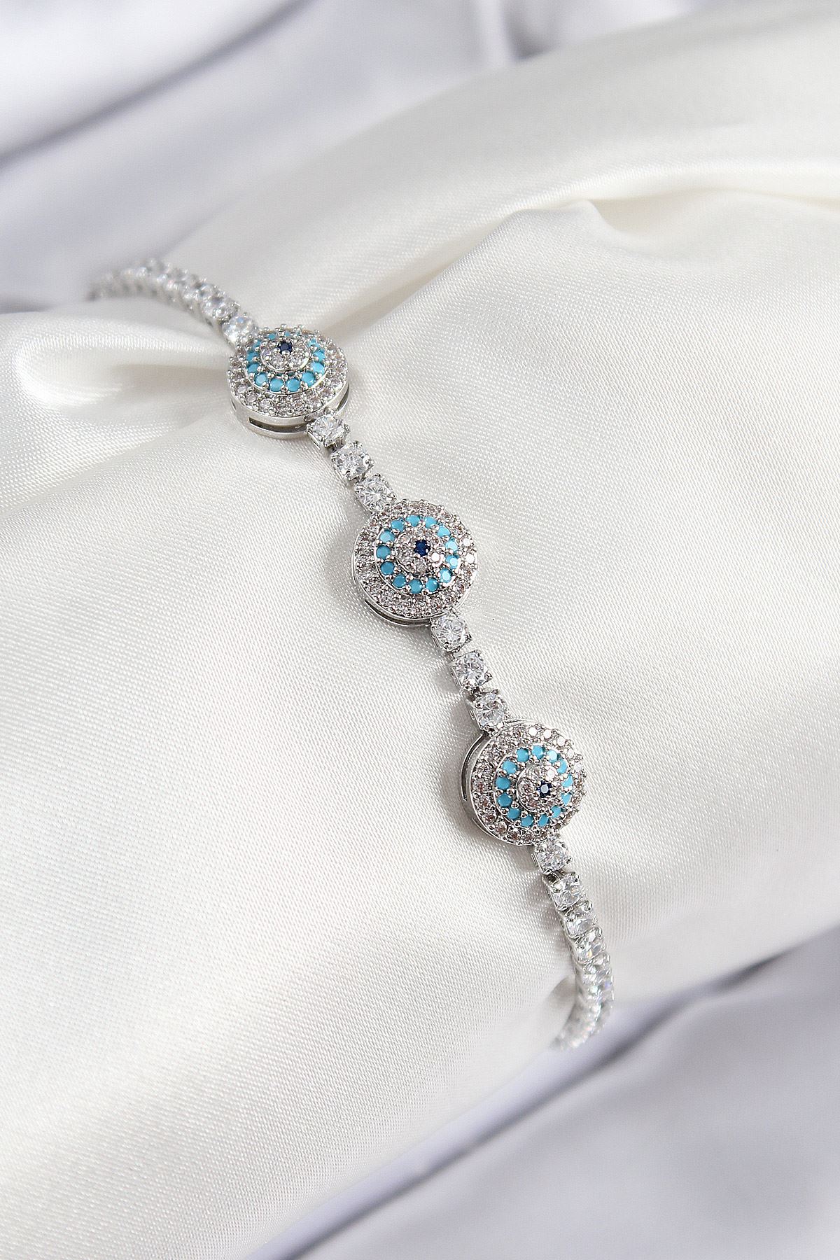 YRTCL Pirinç Zirkon Taşlı Nazar Model Gümüş Renk Kadın Bileklik