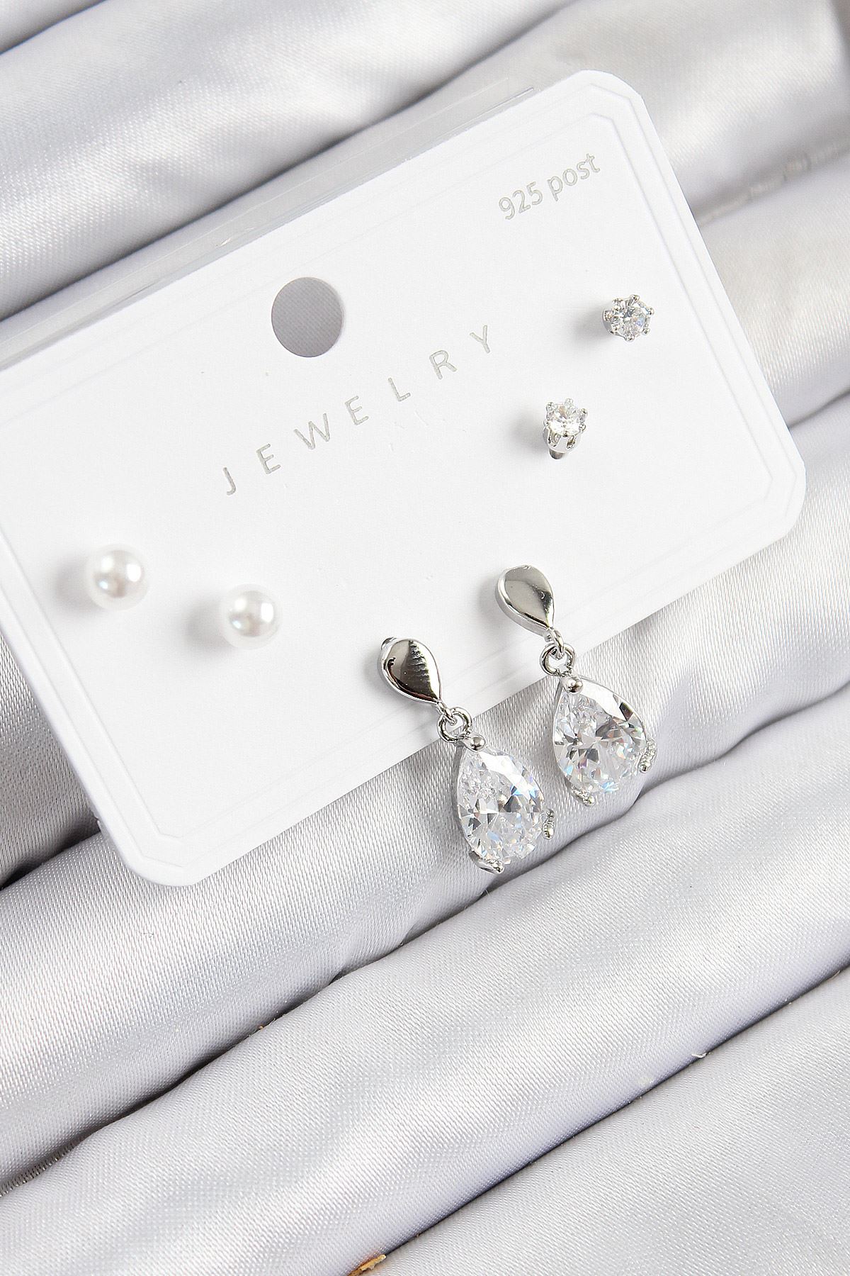YRTCL Pirinç Zirkon Taşlı Sallantılı Damla Model Gümüş Renk 925 Ayar Gümüş Çivi Kadın Küpe Set