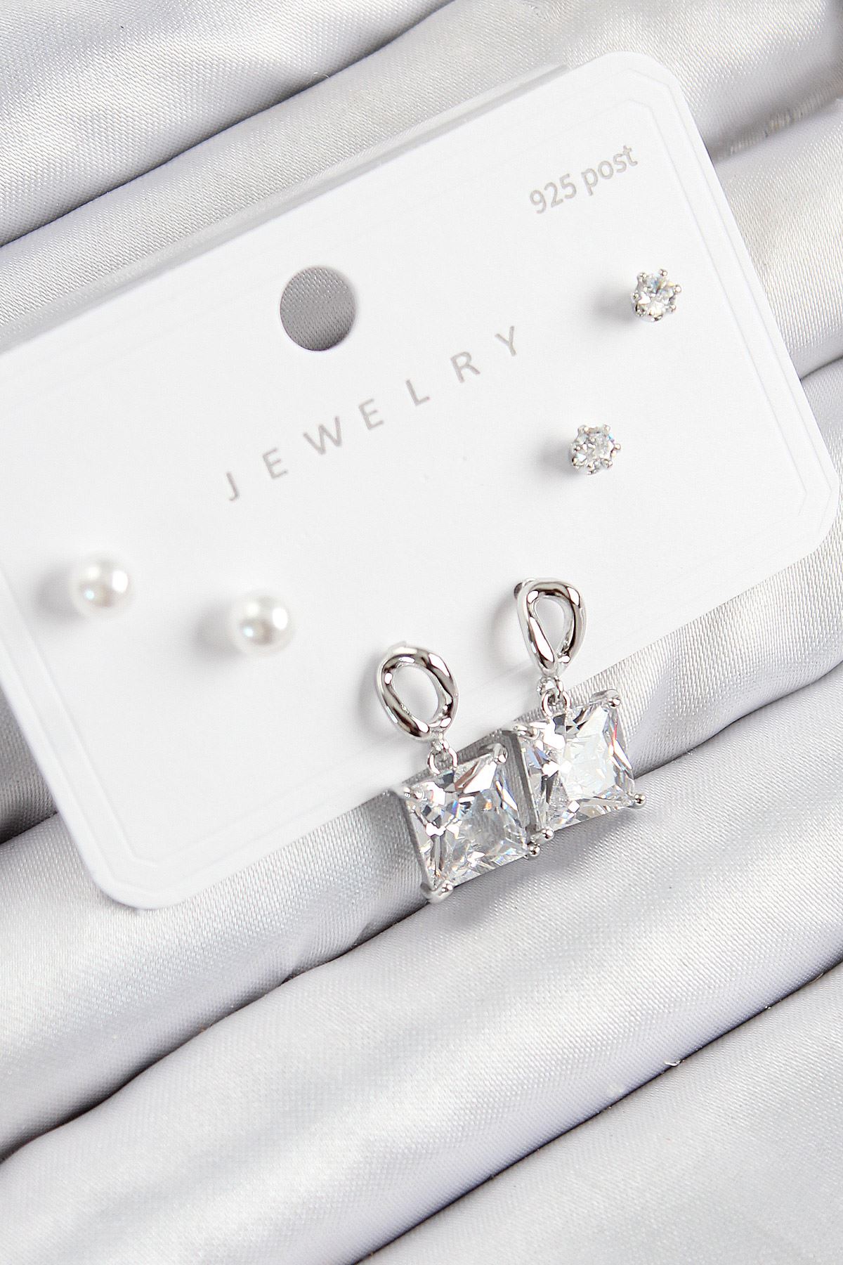 YRTCL Pirinç Zirkon Taşlı Sallantılı Kare Model Gümüş Renk 925 Ayar Gümüş Çivi Kadın Küpe Set