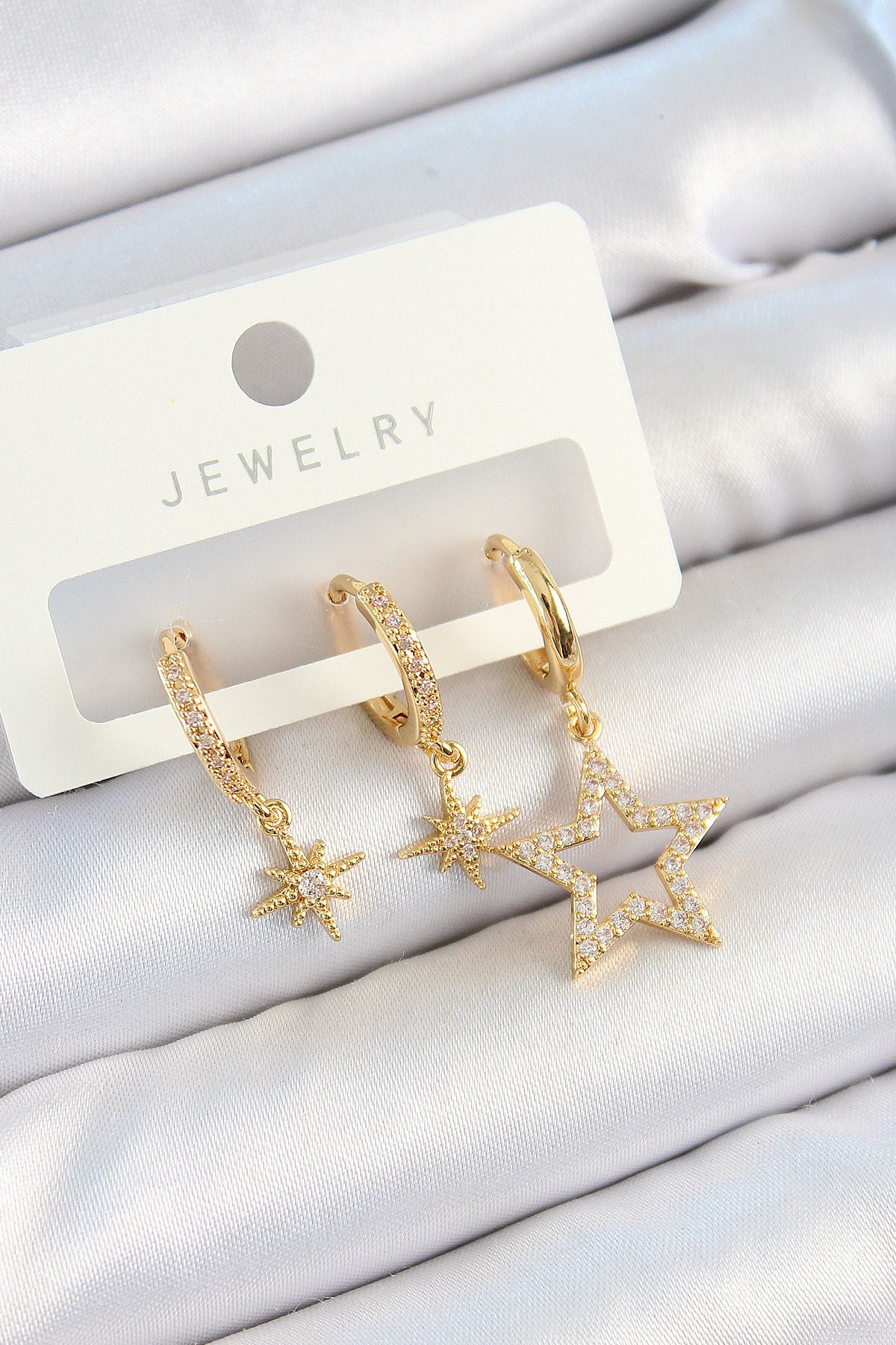 YRTCL Pirinç Zirkon Taş Ve Yıldız Figürlü Gold Renk 3'lü Çift Kadın Küpe Set