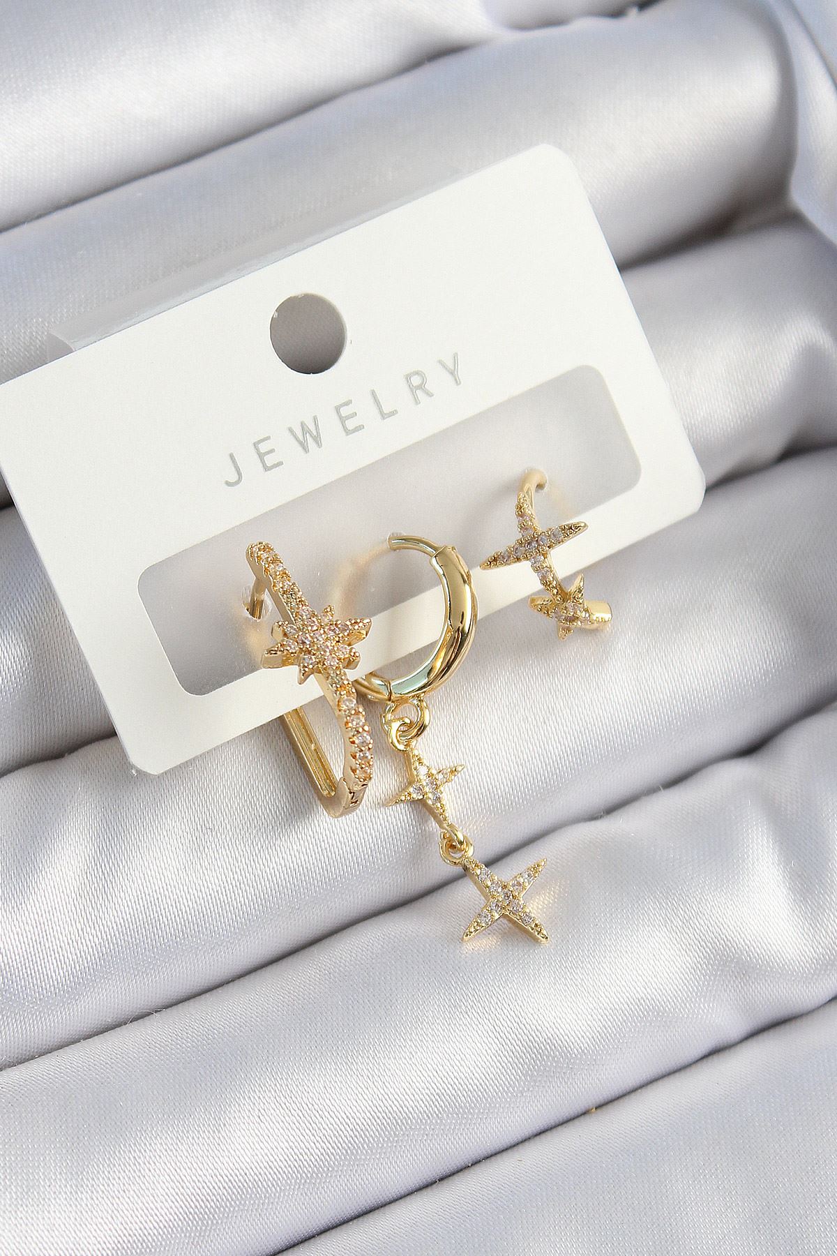 YRTCL Pirinç Zirkon Taşlı Yıldız Model Gold Renk 3'lü Çift Kadın Küpe Set