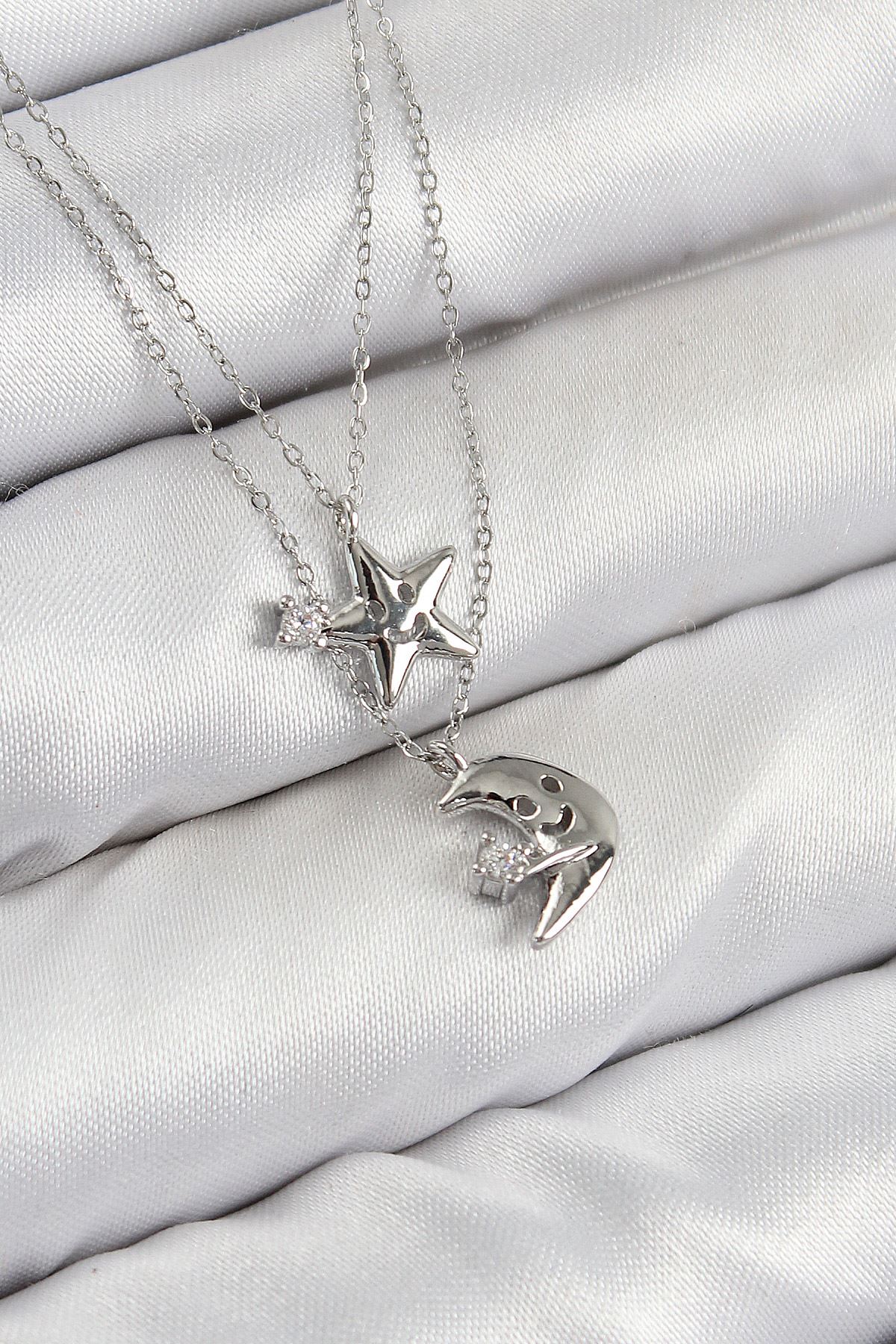 YRTCL Pirinç Zirkon Taşlı Yıldız Ve Ay Model Gümüş Renk Kadın Kolye