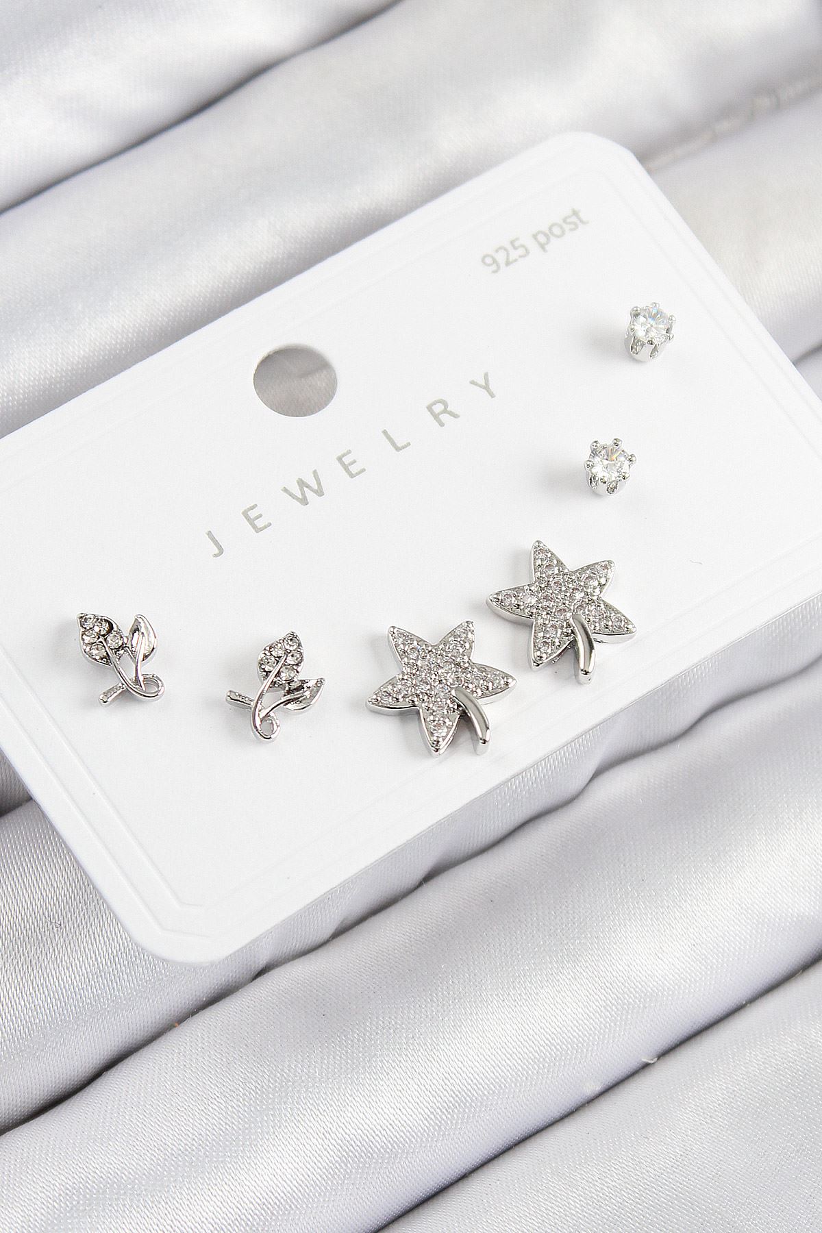 YRTCL Pirinç Zirkon Taşlı Yıldız Ve Gül Model Gümüş Renk 925 Ayar Gümüş Çivi Kadın Küpe Set
