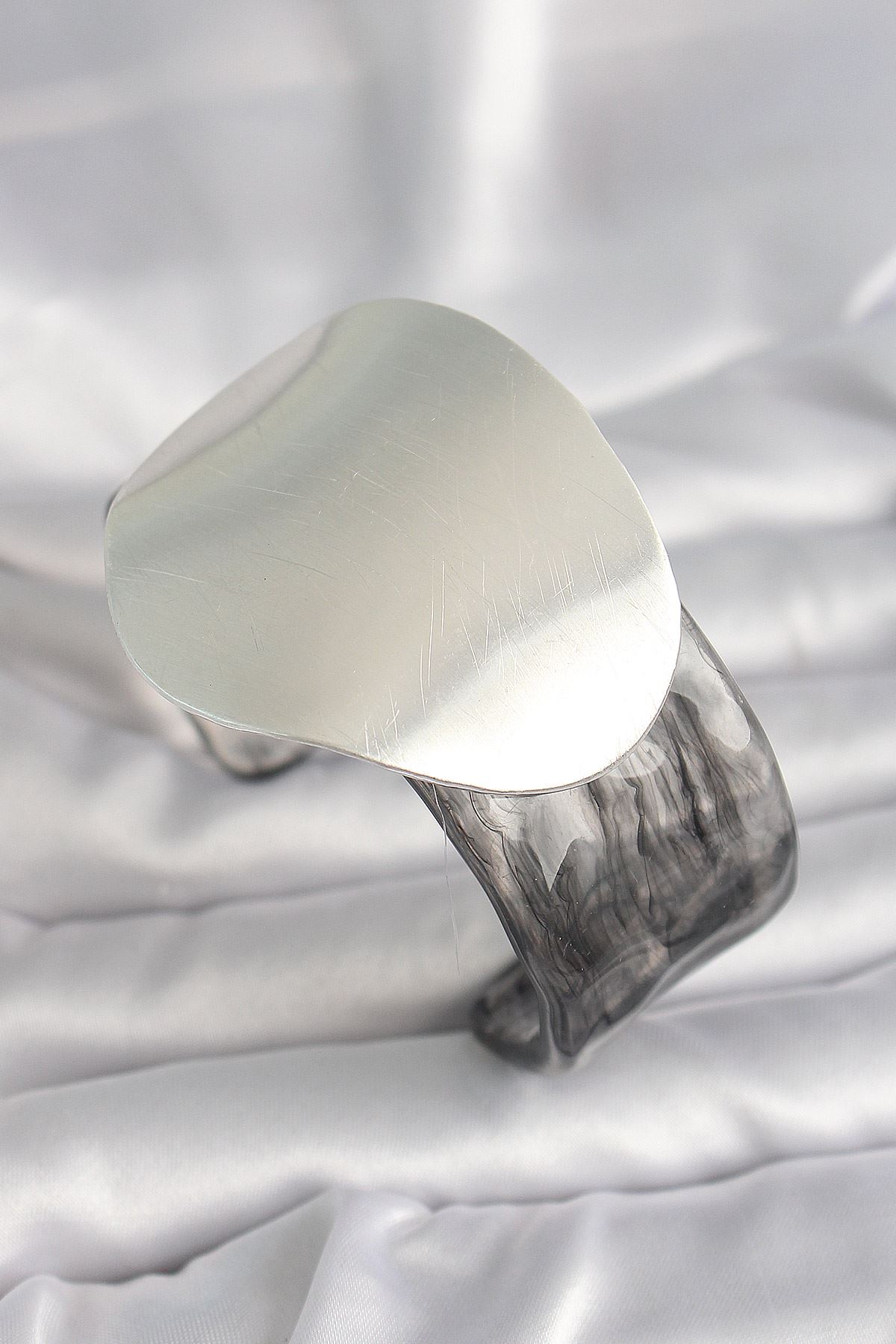 YRTCL Siyah Mermer Desen Akrilik Pilastik Gümüş Plaka Model Vintage Kadın Bilezik