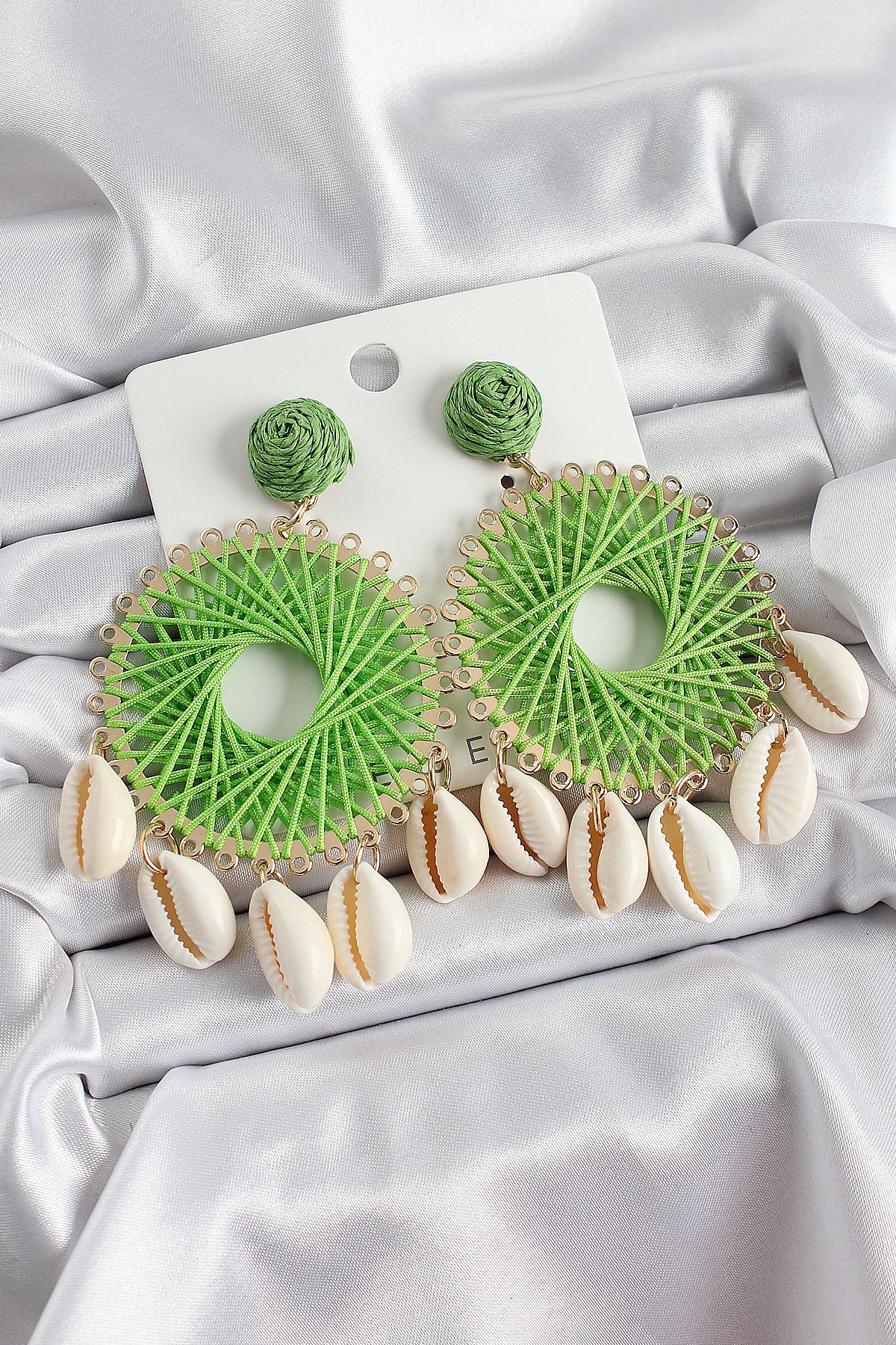 YRTCL Yeşil Hasır Örgü Sarmal Model Sallantılı Deniz Kabuğu Detaylı Gold Renk Kadın Küpe